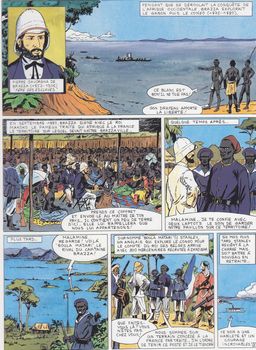 remarques: | 2ème volet: 1871 à 1931, les bâtisseurs d'Empire 1/ guerre en Indochine contre les pavillons noirs (des bandes de pillards chinois) sous le commandement de Garnier, dès 1890, formation de la confédération d'Indochine avec le Tonkin (Hanoi), Laos (Luang-Prabang), Annam (Hué), Cambodge (Phnom-Penh) et Cochinchine (Saigon) 2/ création en 1845 des fameux spahis, occupation et pacification de l'Afrique Occidentale par Gallieni, Archimard, Bonnier et autres officiers >> p. 16 prise de Tombouctou par Joffre février 1894 entretemps, Savorgno de Brazza explore le Gabon et le Congo (Brazzaville) en 1880 alors que Stanley pour le compte du roi des belge occupe le Congo et arrive à Zanzibar, il est surnommé boula matari (briseur de rocher à la dynamite) la mission Marchand en suivant l'Oubangui atteint en 1896 Fachoda aux frontières du Soudan qui doit après coup être rétrocédé aux anglais, Francis Lamy occupe le Tchad en 1898 >> p. 23 carte des opérations en Afrique Occidentale (AOF) comprenant le Sénégal (Dakar), la Guinée (Conakry), Côte d'Ivoire (Abidjan), Dahomey = Benin (Porto Novo), Soudan = Mali (Bamako), Mauritanie (Nouakschott), Haute-Volta = Burkina Faso (Ouagadougou) et Niger (Niamey) ainsi que de l'Afrique Equatoriale (AEF) comprenant le Gabon (Libreville), Congo = république du Congo (Brazzaville), Oubangui-Chari = république Centraricaine (Bangui) et le Tchad (Fort-Lamy = N'Djaména) 3/ Madagascar (une île aussi vaste que la France), les français occupent Tananarive en 1895 et la reine Ranavalena III doit reconnaître le protectorat français administré par le général Galliéni 4/ a) en 1900 les troupes de la marine participent à l'expédition internationale vers Pekin contre les Boxers b) en 1908 débarquement de troupes au Maroc qui sera gouverné par le maréchal Lyautey 5/ guerre 1914-1918 dans laquelle les troupes de la marine (coloniales) participent à toutes les batailles essentielles, occupation du Togo et du Cameroun, colonies allemandes 6/ entre deux-guerres a) 1922 pacification du Liban et de la Syrie b) 1925 guerre du Rif marocain contre Abd el Krim 1927 l'empire coloniale français est à son apogée (13 mio de km2 avec 100 millions d'habitants), 1931 exposition coloniale de Paris >> un album au scénario détaillé et intéressant sur le développement de l'empire coloniale français, le graphisme n'est pas trop élaboré, mais respectable Information - grands conquérants eet explorateurs de l'Afrique à l'époque coloniale française: Francis Garnier, contre-amiral Courbet, capitaine Joseph Galliéni, capitaine Gouraud, colonel Monteil, Pierre Savorgna de Brazza, capitaine Marchand (épisode de Fachoda), René Caillé, François Lamy, le maréchal Lyautey, Henry Stanley et David Livingstone - création des spahis algériens et des tirailleurs sénégalais |