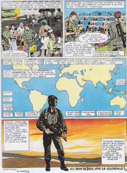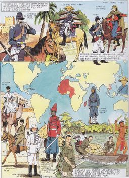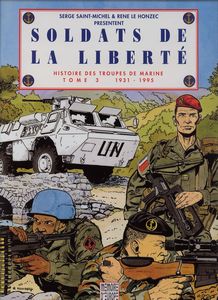 remarques: | 3ème volet: 1931 à 1995, soldats de la liberté au début de l'album hommage par le dessinateur Le Honzec à son père, chef d'escadron ainsi qu'à son grand-père, grand-oncle et oncle, tous qui ont été bigors ou marsoins exposition coloniale de Paris en 1931, en Afrique Eugène Jamot vainc la maladie du sommeil et Yersin invente le serum antipesteux guerre 1939-1945 >> p. 8 l'attaque au coupe-coupe des sénégalais au début l'armée de De Gaulle est essentiellement composée de troupes coloniales, l'épopée de la colonne Leclerc dans le Fezzan >> p. 16 et au nom de dieu vive la coloniale - 1946 début de la guerre d'Indochine >>p. 19 les "touches de piano" effectuées par les viets sur les voies de communication 1952, guerre de Corée 1954, début de la guerre d'Algérie contre les fellaghas, le mot d'ordre est alors: mobilité, rapidité et économie des forces n.b. crapahuter = progresser en terrain difficile 1956, expédition de Suez 1967, pour des raisons politiques les troupes "coloniales" sont nommés troupes de marine 1961 à 1990, interventions dans différents états africains devenus en partie indépendants selon les accords de défense et de coopération dont au Tchad contre le rebelle Hissène Habré soutenu par les libyens >> p. 34 création du DAO (détachement d'assistance opérationnelle) 1977, intervention au Congo/Zaïre sur demande de Mobutu contre les rebelles katangais 1978, intervention au Liban et en Syrie 1980, création de la FAR (forces d'action rapides) dès 1990, guerres du Koweit et de l'Irak (opération tempête du désert) contre Saddam Hussein et missions de sécurité au Cambodge, Bosnie et Ruanda >> toujours encore assez bien développé tout comme le graphisme, louange bien sûr des troupes de marine avec en dernière page: au nom de dieu, vive la coloniale, mais le moins intéressant des trois tomes de la série |