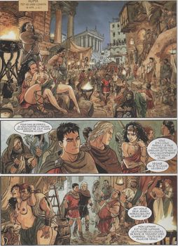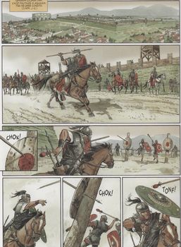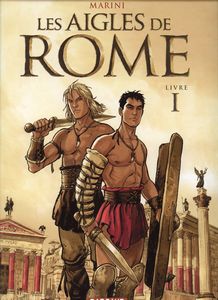 remarques: | première édition, novembre 2007, 58 pages avec glossaire en fin d'album - début d'une magnifique série inspirée peut'être de Murena et d'Alix qui se situe dans l'empire romain en 9 BC sous Auguste, Drusus a pacifié la Germanie, il meurt peu après, mais ses descendants recoivent le titre de Germanicus, toutefois à la mort de Drusus, la Germanie redevient un chaudron de sorcières - pour s'assurer la fidélité des germains vaincus, Rome demande aux chefs germains de leur donner des otages (généralement leur fils aîné) - Marcus Falco, jeune noble romain, doit poursuivre son éducation avec un jeune noble germain, Ermanamer, otage romain du roi des Chérusques avec qui Auguste veut faire alliance et pour cela Auguste donne à Ermanamer la citoyenneté romaine avec le titre de Julius Arminius - Marcus est quelque peu apparenté à la race germaine de part sa mère, une princesse de Germanie qui a été mariée à son père Valerius Falco pour des raisons politiques - Volcanus, un centurion expérimenté, est chargé de l'entraînement des deux jeunes hommes - Arminius devient une vrai guerrier mais Marcus a encore un coeur un peu trop tendre pour un romain >> p. 36 l'épreuve infligée à Marcus par son père sur des esclaves évadés - les jeunes gens deviendront frères de sang et partageront tous leurs loisirs ensemble y compris la visite des lupanars romains dont Marini use à profusion >> p. 51 la visite des lupanars de Rome >> p. 53 Morphea, la plus célèbre prostituée de Rome - retrospective 10 ans plus tôt quand Fraya la sorcière prédit un grand avenir pour Ermanamer alias Arminius >> un sujet antique sur les guerres germaniques peu abordé jusqu'à maintenant (à part le fameux Jacques Martin mais moins élaboré) - un scénario solide et un graphisme soigné fait de ce premier album une complète réussite malgré le langage un peu cru, mais juste ce qu'il faut pour cette époque romaine de plus un glossaire explicite complète la fin de chaque album n.b. décidément Marini n'a pas besoin d'autre scénariste que lui-même pour entamer cette nouvelle série annexes - 1er et 2ème plat de l'album - carte de l'empire romain - deux planches tirées du récit - couverture de la deuxième édition |