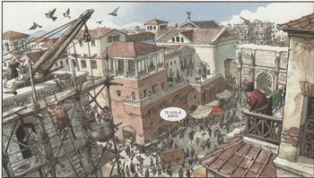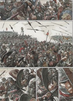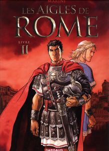 remarques: | 2ème volet des aigles de Rome, première édition octobre 2009, 58 pages avec glossaire en fin d'album - Rome 9 AC, Marcus Falco rentre d'une campagne glorieuse en Illyrie, il rend visite à sa maîtresse Felicia avant de revoir son épouse Silvia qu'il n'aime plus, il est convoqué par le princeps Auguste pour une mission spéciale - retrospective en 4 AC: Marcus s'éprend de Priscilla, fille du sénateur Priscus, mais celle-ci est destinée à l'ami de Priscus = Lepidus, petit-fils du triumvirat Lepidus-Augustus-Antonius, qui veut venger son grand-père maltraité par Auguste - Morphea la prostituée, mère de Priscilla via Prescus, a toutefois d'autres plans pour sa fille et fait ainsi échouer la liaison Marcus-Priscilla qui a déjà causé une brouille entre Arminius et Marcus >> p. 42 Morphea la sorcière - après son histoire avec Priscilla, Marcus est envoyé dans l'armée de Tiberius qui doit réprimer une révolte en Illyrie et en Dalmatie où Marcus se couvre de gloire, il est surnommé "la terreur des Dalmates" >> p. 46 une page d'histoire romaine >> p. 50 Marcus a été honoré par la corona civica, la corona exploratoria et la corona muralis - rentré à Rome en 9 AC, Auguste confie à Marcus la mission de surveiller Arminius qui sert maintenant sous Varus avec Lepidus en Germanie, par la même occasion Morphea demande à Marcus de protéger sa fille Priscilla mariée à Lepidus en Germanie et dont Morphea n'a plus aucune nouvelle, elle donne à Marcus comme compagnon son plus fidèle serviteur: le nubien Cabar - avant de partir, Marcus se réconcilie avec son père qui, avant de mourir, lui confie son anulus aureus et son glaive magnifique (une pièce unique avec la poignée en ivoire et en bois d'ébène, la lame est faite des plus solides et des plus précieux des métaux, elle a été forgée de main de maître par des gaulois) n.b. hommage aux gaulois >> un épisode surtout érotique et romantique (les amours de Marcus occupant la majorité du récit), un peu moins élaboré que le précédent (les aigles volent un peu plus bas) mais qui reste toujours très intéressant en approfondissant le caractère des personnages pour la nouvelle aventure qui se prépare en Germanie sans négliger l'aspect historique et le graphisme y compris le coloriage de Marini qui reste superbe, >> voir comme exemple la page 36 annexes - couverture de l'album - deux planches tirées du récit - vignette extraite de la page 36 |