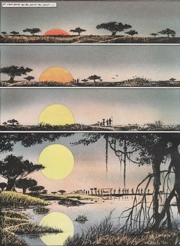 remarques: | le "Marie-Caroline" est en fait un vaisseau négrier et doit faire le plein de sa cargaison de "bois d'ébène" sur la côte africaine au port de Juda (Dahomey), après le débarquement, on se rend au fort St-Louis où l'intrigue règne parmi ses occupants, le comptable Viaroux veut posséder Isa et à cette fin organise avec un sorcier noir de lancer un sort sur Hoël qui tombe dans un profond coma Aouan, un guerrier noir, veut aider Isa à trouver l'antidote pour guérir Hoël pour ce faire, une expédition est préparée pour se rendre chez le roi Kpengla >> le scénario est cette fois impeccable avec une description très prononcée des différents personnages et avec un graphisme à nouveau superbe |