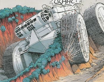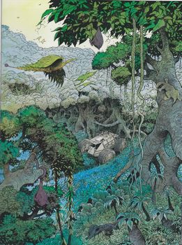 remarques: | Cyann, Nacara, Crysane, Jadde et les autres cosmonautes sont en route pour la planète Ilo, mais à l'arrivée au système Ilo, un court-circuit ravage le poste de pilotage Cyann décide d'abandonner le vaisseau et de gagner Ilo à l'aide des modules, celui de Cyann se pose sur un lac gelé, mais celui de Crysane est porté disparu la base d'Ipsa sur Ilo est trouvée complètement démolie >> p. 14 des survivants et des cadavres de dogodons >> p. 19 les ziglones qui résistent au froid le module de Crysane est retrouvé, mais celui-ci continue son chemin sans attendre celui de Cyann lors de la poursuite, le Stamo-2 de Crysane s'échoue dans une coulée de lave et ses occupants s'enfuient à nouveau >> pl. 34 progression dans la jungle d'Ilo grâce toutefois à un message de Crysane, le Stamo-1 de Cyann se rend à la base de Fifi (des îles flottantes), celle-ci est occupée par des hostiles qui s'enfuient après y avoir mis le feu la poursuite continue en direction de la base Charnière >> p. 50 la guérison de Sépion à l'écorce de Pelipela au jour 63 de la mission Ilo, le Stamo-1 est rejoint par un curieux cavalier (un trotilier = dompteur de trotile >> voir lexique) Cyann fait alliance avec le trotilier et en tombe même amoureuse >>Y p. 75 l'histoire d'Ilui le trotilier d'Aldalarann mort d'Ilui piqué par une lucinelle, un insecte dangereux, Cyann qui l'accompagnait est sauvée par des rebelles dont Crysane fait maintenant partie et qui apprennent à Cyann que les Deos règnent en maître sur la partie nord d'Ilo l'histoire des rebelles et de l'antidote contre la fièvre pourpre, Cyann s'allie avec les rebelles pour attaquer la base des OdeOs Nacara, partie en éclaireuse, rencontre Zhey, une ancienne connaissance de la planète Olh, maintenant une OdeO = chef d'un clos Deo (= une base sur Ilo) l'histoire des grandes portes = téléporteurs qui permettent aux DeOs de passer directement de Olh à Ilo, c'est le réseau du Grand Orbe les Vê sont toutefois les contrôleurs des grandes portes et le grand contrôleur Vê retire aux Deos leur droit de passage pour le transmettre à Cyann alors que Nacara qui a déjoué le système de défense des Deos, retourne auprès de Cyann après s'être emparé du secret de fabrication de l'antidote contre la fièvre pourpre >> p. 108 l'initiation de Cyann au contrôle des grandes portes >> un deuxième album de la série consacré cette fois presque entièrement à l'exploration d'une planète, exploration qui se révèle diablement compliquée, des aventures plutôt intéressantes et surtout un très bon graphisme nota bene - quelque similitude avec les séries de Leo (Aldaberan, Bételjeuse) et avec le fim "Avatar" - différence entre les OdeO = chef et les DeO = simples religieux - album de 112 pages cette fois |