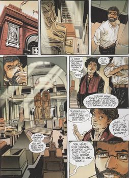 remarques: | la suite et fin de la quête de Mervan Khadder pour la vérité résumé: soutenu par le Vatican, Mervan parviendra à soustraire au musée nationale égyptien du Caire les fameux documents cachés par Halid, mais de retour au Vatican, le vieux cardinal Stimac décédé, Mervan n'a plus confiance en son successeur le cardinal Gandini, Mervan, avec un nouveau visage et une nouvelle identité se retire de la course en laissant les extrémistes arabes s'en prendre au nouveau cardinal mais avant de disparaître, Mervan sabote toute l'opération en gardant pour lui une pièce-clé des documents récit: Le Caire, Mervan est à la recherche des fameux documents cachés par Halid au musée national du Caire, Mervan sous l'identité de Gamal se fait passer pour un archéologue arabe, mais ses recherches n'ont toujours pas abouti grâce à un renseignement soutiré à la conservatrice du musée, Mervan croit avoir maintenant découvert la cachette quand soudainement il rencontre Latifa avec qui il convient d'un rendez-vous mais celle-ci est surveillée et les soupçons se portent sur le dénommé Gamal les intégristes ont démasqué Gamal alias Mervan mais celui-ci les prend de vitesse et arrive à récupérer les documents avant que les intégristes n'arrivent à l'arrêter >> p. 30 la petite Latifa passée à la question >> p. 32 à 41 le plan de Mervan pour s'emparer des documents et les faire sortir du musée en créant une diversion avec un faux incendie et en s'enfuyant par les égoûts retour à Rome sous une identité helvétique, les documents sortant d'Egypte par courrier diplomatique via l'ambassade suisse, les documents sont remis au cardinal qui meurt peu après avoir pris connaissance de la mort de son amour Melina, c'est le cardinal Gandini qui lui succède mais Mervan n'a plus la même confiance en Gandini qu'en Stimac et garde pour lui une pièce-maîtresse des documents entretemps, Mervan change d'identité et de visage après une opération esthétique, de ce côté-là il est en sécurité alors que son amie Latifa meurt dans un accident provoqué par les intégristes; Mervan soupçonne le cardinal Gandini de garder les documents uniquement pour son intérêt personnel, une sorte d'arme secrète, c'est pourquoi Mervan a gardé une pièce-maîtresse des documents pour l'utiliser si le cardinal Gandini ne met pas le projet de Stimac en application avec son nouveau visage et sa nouvelle identité, Mervan parvient à contacter Aline et à renouer incognito de nouvelles relations avec elle et en dernière page, la pièce-maîtresse est laissée à l'abandon alors qu'un agent intégriste s'est déjà infiltré dans l'entourage du cardinal Gandini >> une fin plutôt précipitée laissée à l'appréciation et à l'imagination du lecteur, scenario et graphisme bien moins élaborés, surtout pour le scénario qui comprend de nombreuses cases vides, par exemple l'action de Mervan dans le musée qui prend à elle seule une dizaine de pages pratiquement sans texte, bien sûr le manque d'imagination se fait sentir et il fallait d'une façon ou d'une autre terminer ce deuxième cycle qui ne pouvait d'ailleurs plus être aussi intéressant que le premier cycle qui lui est véritablement un chef-d'oeuvre; toutefois une couverture d'album appropriée, très réaliste et d'actualité n.b. et il n'y aura pas de troisième cycle |