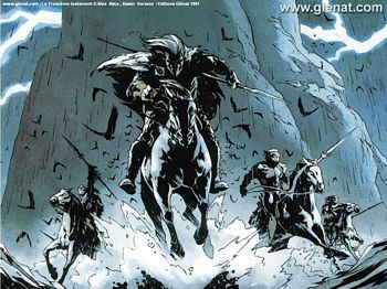remarques: | Ier tome, couleur, 48 pages thème des évangiles en heroïc-fantasy, série innovatrice, un très beau graphisme, mais un scénario assez complexe 2ème édition, juin 2007 (EO = octobre 1997) le comte de Marbourg est condamné au bûcher pour avoir pactisé avec Satan alors qu'il avait été nommé inquisiteur par Gregoire IX, mais il échappera au bourreau 20 ans plus tard au monastère de Veynes (en 1306), des anciens manuscrits, ce seraient ceux de Qumran, et un coffre secret sont découverts >> p. 9 référence au scriptorium d'Umberto Ecco et au chercheur Sean Connery 1307 en Bretagne, une altercation oppose Elisabeth d'Elsenor avec son père, l'archevêque d'Elsenor au sujet d'un invité spécial: le comte de Marbourg l'archevêque charge Marbourg de retrouver ces manuscrits qui pourraient mettre en cause le dogme de l'Eglise et qui ont été dérobés du monastère de Veynes, le prieur du monastère de Tourmalet pourra donner d'autres informations utiles à ce sujet, par la suite, l'archevêque est assassiné et avant de mourir, il confie sa fille Elisabeth à Marbourg >> p. 22 à 25 la fuite dans la cathédrale de Paris alors que le grand inquisiteur papal apprend d'un espion auprès du "maître" que celui-ci a découvert la première partie de l'énigme = "le réveil du lion", Marbourg et Elisabeth arrivent à Tourmalet >> p. 32/33 l'épisode du pont où Marbourg se débarrasse d'un poursuivant à Tourmalet, le prieur Honorius les informe de la parabole de Julius de Samarie, un écrit apocryphe à qui Dieu avait confié un coffre qu'il ne devait pas ouvrir, Julius finit par ouvrir le coffre et meurt d'horreur en voyant son contenu le reliquaire de Julius serait la clé du savoir ultime, mais tout ce qu'un homme doit connaître, c'est la volonté de Dieu; l'histoire d'Honorius qui dissimula un parchemin de Qumrân et qui est maintenant menacé par plusieurs sources >> p. 39 la quête du savoir doit s'arrêter là où commence la vanité devant Dieu, Honorius dixit d'autres informations pourraient être obtenues dans une bibliothèque secrète à Tolède et la chasse pour la cachette de Julius continue, mais peu après le départ de Marbourg et Elisabeth, le monastère de Tourmalet est détruit par une horde de cavaliers noirs >> premier volet d'une série mystique, si le graphisme est de très bonne facture, le scénario n'est pas toujours très limpide, quoique ce premier volume donne un bon début à la série >> deux étoiles pour l'univers graphique particulier de cet album n.b. le lion = symbole de l'évangéliste Marc et Marbourg est le fils du lion |