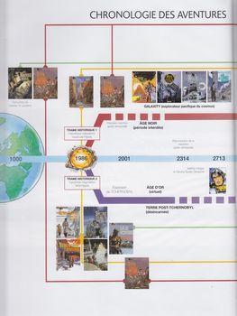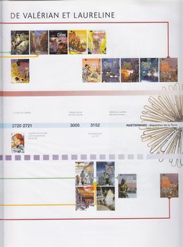 remarques: | album de 59 pages c'est un peu un résumé des albums précédents, retour à la planète d'Hypsis chez la Triade qui veut mettre en route le projet Vivaxis et intervenir auprès d'une société terrienne en biotechnologie et génétique, c'est à dire de cesser leurs recherches sur la nature humaine par manipulation génétique apparition d'un nouveau personnage: SAT (= Lucifer qui vit dans le centre de chauffage de Point Central) et qui veut contrecarrer les projets de la Sainte Trinité, un accord est trouvé: contre de riches royalties, la Sainte Trinité accorde le contrôle de Vivaxis à Sat et en contre-partie pour Valerian et Laureline, toujours préoccupés du sort de Galaxity, celle-ci est ressucitée >> p. 45 apparition sur la Terre de Dieu, son fils, le Saint-Esprit et de Sâtan >> un album quelque peu farfelu au scénario diablement spirituel reprenant des thèmes du passé qui ne convainquent plus beaucoup malgré le plan chronologique des aventures de Valerian en page d'avant garde annexes - couverture de l'album - chronologie des aventures de Valerian et Laureline: - 1000 - 1986 - 2001 - 2314 - 2713 - 2720/2721 - 3005 - 3152 jusqu'à indéterminé: disparition de la terre |