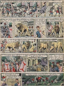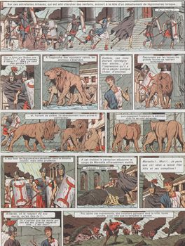 remarques: | le premier album de la série mythique des Alix, dessiné et colorié par Jacques Martin, un coloriage (en héliogravure?) en alternance avec des pages en lavis, imprimé par les fameuses éditions Cortenbergh qui ne sera jamais plus égalé, seul album au coloriage parfait, mais uniquement en EO 1956 les débuts d'Alix depuis Khorsabad en Gaule, au prise avec ses ennemis Arbacès, Marsalla, Brutus et Pompée mais soutenu par le grand César, les meilleurs planches se situent à Rome (course de chars, lutte de gladiateurs et sauvetage d'Alix) mais aussi quelques belles autres planches tel la bataille navale, le colosse de Rhodes, etc >>> le scénario est certainement inspiré du roman de Ben Hur et contient quelques anomalies avec de superbes planches, l'album est encore à 62 pages avec une vignette à suspense sur chaque fin de page, 4ème plat peau d'ours, dernier titre "le puit 32", 22 titres, imprimerie Cortenbergh, édition française. valeur BDM Euros 250.- en BE en annexes: - couverture et 4ème plat de l'album - deux couvertures parues dans le Journal Tintin - une page de l'édition originale comparée à une page de la réédition (couleur terne) |