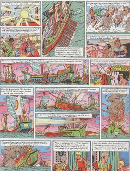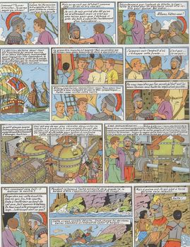 remarques: | 3ème volet des aventures d'Alix, album Lombard 1957, édition belge, 64 pages, 4ème plat aux damiers rouges, dernier titre "le puits 32", 28 titres, imprimerie Charles Bulens scenario tout à fait intéressant (science fiction antique), inspiré principalement de Flaubert (Salambô) auteur favori de Martin, le graphisme devient toutefois moins élaboré, se rapprochant de la ligne claire de Hergé, bon coloriage mais moins nuancé que les 2 premiers albums, le graphisme de ce 3ème album restera toutefois unique ainsi que le personnage d'Alix dessiné d'une autre façon. cet album fera l'objet de deux rééditions sans changement sauf deux couvertures modifiées. l'action se déroule d'abord à Carthage sous la domination romaine où le mage Lydas est enlevé par de mystérieux inconnus qui possèdent des armes secrètes puissantes (miroir solaire, feu marin, baliste à flèches enflammés, etc) on y retrouve Arbacès (avec la formule de la poudre explosive), allié avec Galo, un riche carthaginois et son assistant Segabal, Arbacès réussit à prendre la fuite vers l'île maudite, mais Alix réussira à capturer Segabal qui le conduira à l'île maudite gouvernée par Sardon, l'homme noir et Arbacès, après plusieurs péripéties, Alix réussira à vaincre ses adversaires et l'île maudite sera anéantie par un cataclysme ainsi que tout ce qui s'y trouve sera détruit, particulièrement les nouvelles inventions qui n'ont encore rien à faire à cette époque. 4 nouveautés dans cet album: 1/réapparition de Enak en page 16 à la demande de nombreux lecteurs 2/nombreuses catastrophes naturelles (tempête, tremblement de terre, éruptions volcaniques, tsunami) 3/Martin y introduit quelques mentions d'humour (p. 40-41-43) 4/mort d'Arbacès (qui sera toutefois ressuscité dans le prochain album) curieusement, cet album est le plus cher de la série (Euros 500.- au BDM) |