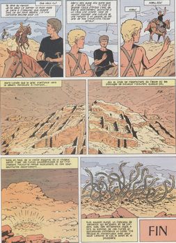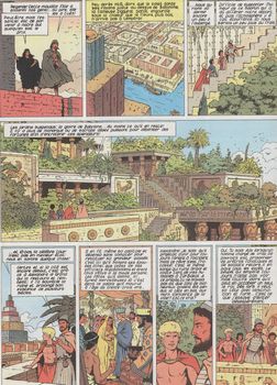 remarques: | Alix retourne à Jérusalem et Babylone sur demande du roi Oribal mais sur leur route, un mystérieux homme noir les suit de près à Babylone, Alix apprend que Oribal a été assassiné par les complices de son adversaire Hor-Khal, comme preuve, Adroclès (le frère d'Arbacès) lui apporte la tête d'Oribal >> p. 6 que tous nos dieux vous protègent, leur aide sera peut'être nécessaire et c'est l'avantage d'en avoir beaucoup au lieu d'un seul, celui des juifs l'action se passe principalement à Babylone, sur la Tour de Babel (ou Bab-El)= le ziggourat du Baal-Elon, >> p. 29 l'origine du nom de Babel: Baal Ilou, Baal-Elou, puis Baal-El et Babel avec la ville de Babylone (en grec, qui veut dire "porte du dieu" en babylonien), >> p. 26 visite aussi de Babylone (capitale d'Alexandre le Grand) et de la porte d'Ishtar, avec p. 36 les jardins suspendus rencontre avec Marah, la petite bergère aux pouvoir magiques de par ses yeux, mais qui mourra mordu par un serpent venimeux, à nouveau le serpent comme symbole de Martin, particulièrement en dernière page d'où surgissent de la tête d'Oribal, qui avait été enterrée, un faisceau de serpents >> rien de particulier dans cet album, à nouveau un bon graphisme, c'est quelque peu la suite de la tiare d'Oribal, hommage à Arbacès via Adroclès et Alix, les deux protagonistes s'estimant mutuellement à la fin du récit, c'est un peu aussi une chasse à l'homme, resp. à l'homme noir à noter: - l'histoire du règne d'Oribal qui n'a pas su trouver une bonne ligne de gouvernement - dissertation sur le dieu des juifs, un dieu loin de son peuple et qui se fait craindre (Martin dixit) |