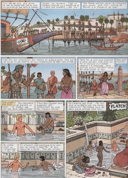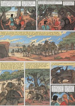 remarques: | 4ème retour en Egypte pour Alix et Enak, invités par Cléopâtre et le pharaon nubien Djerkao qui désire marier le prince Enak à sa soeur Markha, princesse égyptienne, ceci pour des raisons politiques, vu le refus d'Enak, nos deux amis sont retenus prisonniers, mais comme ni Markha ni Enak ne sont intéressés par ce mariage, celle-ci les aide à s'enfuir pourchassés par Djerkao, le trio doit s'enfuir par le nord, le sud étant bloqué par l'armée de Djerkao, et ils finissent par arriver aux sources du Nil, selon Enak en page 30 "au fin fond de l'Afrique", en tout cas l'Afrique noire pour le blond Alix n.b. le lac Maréotis est le nom antique du lac Mariout, situé dans le nord de l'Égypte, à l'extrémité ouest du delta du Nil et la cité de Canope aurait été fondée par des Spartiates de retour de Troie, leur navire aurait été déporté et le pilote du navire, Canopos aurait aussi donné son nom au canal qui reliait les deux villes d'Alexandrie et de Canope s'en suit une série d'aventures les menant aux prises avec de nombreux animaux sauvages, des affreux hommes-lézards (les Titans?), des singes et un fleuve à la couleur verte contenant une vase nauséabonde et empoisonnée (le fleuve de Jade) où Markha va se noyer, et après bien des péripéties, Alix et Enak rejoidront Alexandrie d'où ils repartent pour Rome à noter - p. 5 le char somptueux qui amène Alix et Enak chez Cléopâtre - p. 7 les pyramides au revêtement encore scintillant - p. 8/9 consultations d'oracles à tort et à travers avec chacun qui reçoit son fétiche protecteur - p. 10 le passage des cataractes - p. 13 brève réapparition de Qââ - p. 17 l'histoire enfantine du dieu crocodile Sobek - p. 27 le fleuve de Jade, un joli nom pour un fleuve répugnant = ancien bras de fleuve qui forme une étendue d'eau bizarre empoisonnée par un minérai, genre de cuivre >> p. 29 la mort de la princesse Markha dans l'eau verte gluante - p. 30 Alix et Enak restant seuls au fin fond de l'Afrique avec des singes dixit Enak - p. 31 apparition des hommes-lézard qui massacrent et croquent les singes >> un album sans grand intérêt, le graphisme est faible et le scenario encore plus faible avec un pauvre texte répétitif et une collaboration peu positive de Marc Henniquiau et Rafaele Morales toujours mentionné sur la couverture, ce qui n'est pas vraiment une marque de qualité |