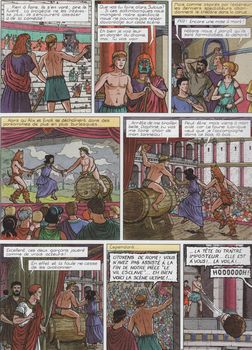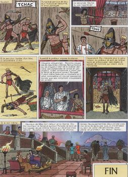 remarques: | album produit par Rafael Morales avec la collaboration de Marc Henniquiau pour les personnages Rome, Ostie, l'ex-gouverneur de Trebizonde, le sénateur myope Quintus Arenus ((>>> voir Alix l'Intrépide) avec sa lunette d'émeraude et sa femme Julia (>>>voir la chute d'Icare) donnent une orgie qui est interrompue par des brigands qui en font un carnage, ceux-ci sont dirigés par un homme qui se fait appeler Alix, Julia et quelques autres réussissent à s'enfuir, mais le vrai Alix est accusé des meurtres et emprisonné les partisans de César dont Corus Maler (>>> voir le spectre de Carthage) avec l'aide des Molochistes passés au service de César (>>> voir le tombeau étrusque) délivrent Alix qui se met à enquêter sur le faux Alix qui finalement est découvert, arrêté et condamné aux jeux du cirque où il défiera Alix dans un combat à mort, mais avant de porter un coup fatal à Alix, il sera tué par un archer à la solde de Pompée qui veut éliminer ce complice gênant suite aux avertissements de César, prêt à incendier les villas et les biens des partisans de Pompée à voir: - p. 8 les thermes romains avec personnages - p. 12 la condition gauloise façe aux romains - p. 14/14 les molochistes, soumis à César, n'y vont pas de main morte sur les vivants >> p. 18 le théâtre ambulant servant à l'enquête d'Alix pour retrouver son pseudo-sosie - p. 20/21 les séances de théâtre à Rome avec mise à mort réelle - p. 36 l'expression de César: ah Roma Roma répété par Alix en page 48 n.b. s'encourir ou encourir = s'exposer à quelque chose de fâcheux, mériter une peine >> à nouveau un album déplorable, mais ce sera probablement le dernier album dessiné par Morales, le graphisme n'est vraiment pas fameux et si Morales arrive assez bien à reconstituer les décors historiques (particulièrement les toges des senateurs romains >>> voir page 39), les personnages sont vraiment mal dessinés et le scénario ne vaut guère mieux (voir exemple typique l'enlèvement du petit enfant par Sulcius en page 37) sauf pour les échanges continus de messages avec César par pigeons-voyageurs, mais c'est surtout le lecteur qui est le pigeon de la farce >> 4ème et dernier album sur Alix créé par Morales, à partir du prochain album les dessinateurs se succèderont sans améliorer grandement la qualité de la série |
