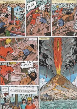 remarques: | premier album dessiné par Christophe Simon et Cédric Hervan, scénario par François Maingoval retour aux sources pour Alix qui à Khorsabad avait perdu sa soeur Alexia (>>> voir Alix l'Intrépide), mais le début du récit ne concorde pas au développement du premier album, car le général Massala venait de terminer le siège de Khorsabad et Alix qui avait survécu essayait de se cacher le mieux possible dans les ruines rencontre avec le général Surena où l'on apprend que Alix avait perdu sa soeur, Alexia, après la bataille de Carrhae Alix reçoit comme mission par Orodes, roi des parthes, d'apporter à César une jarre en or pleine d'or pour le dissuader de faire campagne contre les parthes, mais avant de retourner à Rome, Alix veut visiter Khorsabad où il manque de peu d'être exécuté par le gouverneur de cette ville qui n'est autre que son vieil ennemi Arbacès affublé maintenant d'une barbe à l'assyrienne Alix y échappera grâce à l'intervention d'un ancien centurion, déserteur de l'armée de Crassus, Scevolla, qui délivrera Alix; en contre-partie, il demandera à Alix d'intervenir auprès de César pour lui rendre son grade dans l'armée romaine à voir: - pages 3 à 8 l'histoire des origines d'Alix - page 6 le roi Orodes qui s'endort pendant les discussions - page 12 Arbacès qui porte maintenant une barbe - page 16 Arbacès fait entraver Alix et Enak avec leurs propres vêtements - page 19 Arbacès avec deux personnages qui ressemblent beaucoup aux deux chinois du sphinx d'or - page 25 heureusement qu'Arbacès se soit déjà rasé avant de prendre la fuite - page 34 Enak le pessimiste - pages 37 et 43 Scevolla le centurion qui demande pardon à genou en s'humiliant pour avoir trompé Alix (une position indigne d'un officier romain) - page 41 les îles Eoliennes >> nouvel album en collaboration avec Simon pour le graphisme qui est en amélioration (les personnages sont mieux dessinés), le graphisme de la première moitié de l'album est meilleur que la dernière moitié (dessinateur différent?) >> à voir les décors bien marqués dans la première partie et les planches sombres 36/37 permettant à l'aveugle d'agir dans son élément, par contre le scenario reste assez faible malgré une approche aux sources qui est surtout un peu réchauffée Information les îles Éoliennes (Isole Eolie en italien) ou îles Lipari du nom de l'île principale, sont un archipel volcanique situé au nord de la Sicile en mer Tyrrhénienne le nom provient de Eolo = dieu du vent dans la mythologie grecque et ces îles qui subissent souvent un vent fort ont peut'être donné leur nom aux hélices éoliennes qui transforme l'énergie cinétique du vent laquelle est ensuite transformée en énergie électrique |