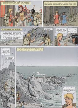 remarques: | dessinateur: Ferry (Ian Kalédine), scénariste: Patrick Weber expédition en Armorique chez les Vénètes pour Alix et Enak en mission pour César à la tête d'une cohorte qui doit rejoindre le camp assiégé de Labienus à la pointe du cap Raz, mais l'expédition se fait surprendre et Alix est fait prisonnier, alors que Enak réussit à s'échapper, toutefois Alix réussira aussi à s'échapper un peu plus tard et rejoindra gravement blessé le camp de Labienus. le plan de César est de détruire Tarania, la cité sacrée des Vénètes afin d'avoir le champ libre pour son invasion de la Grande Bretagne, en se déguisant en esclaves échappés, Alix et Enak réussiront à s'infiltrer dans Tarania, mais ils seront démasqués et condamnés à mort, puis sauvés finalement par la flotte de Brutus qui arrive en renfort et détruira complètement Tarania à voir: - p. 6 les légionnaires qui atteignent l'océan et se baignent en quittant leurs armes et en ne postant aucune sentinelle - p. 8 après l'embuscade, tout dépend d'Enak rescapé dans la profonde forêt d'Armorique - p. 10 les gaulois qui craignent la tempête de Teutatis et le feu du ciel = Belenos - p. 15 Alix dans la grande forêt d'Armorique, confronté à une horde de sangliers, coup d'oeil à Obélix ? - p. 17 Alix qui se meurt - p. 21 des boy-scouts antiques bien équipés - p. 30 le maître des maîtres = une vieille femme - p. 32 le légionnaire VULPUS qui a peur des loups - p. 34/35 le conservatoire de la mémoire des celtes >> à nouveau un album très faible dessinée par Ferry qui dans cette série n'est pas vraiment à la hauteur pour le graphisme de la série d'Alix, ce sera d'ailleurs le seul album de la série Alix illustré par Ferry et le scénario n'est vraiment pas très recherché non plus Information - Tarania cité d'Armorique dont le nom est dérivé de Taranis, dieu du ciel et de l'orage de la mythologie celtique, peut être assimilée à la cité légendaire d'Ys en Bretagne, capitale cornouaillaise du roi Gradlon, qui aurait été engloutie par l'océan, ceci résultant des péchés de ses habitants, mettant en valeur les évangélisateurs bretons la pointe du Raz est un promontoire rocheux constituant la partie la plus avancée vers l'ouest du cap Sizun, face à la mer d'Iroise au sud-ouest du Finistère |