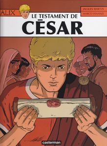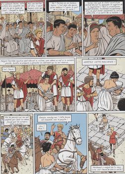 remarques: | 29ème album sur les aventures d'Alix, scénario et graphisme par Marco Venanzi (auteur aussi de Jhen et masque rouge), Rome où César confie un document (son testament) à la prêtresse de Vesta tandis que Alix et Enak rencontrent à Ostie Thessalos d'Epidaure, médecin et ami de Galva (ancien centurion, devenu général de César) qui vient de l'inviter pour le mariage de sa fille Cecilia, son autre fille Aurelia étant prêtresse de Vesta durant la nuit de son mariage, Cecilia est assassinée parce que Aurelia menacée lui a confié la clé du coffre contenant le testament de César, s'en suit une enquête où Alix est arrêté, puis délivré par Octave enfin lavé de tout soupçon, l'assassin Pertinax ayant avoué et dénoncé ses complices = un nouveau complot de Pompée contre César (?), Alix, mentionné comme successeur de César dans le testament, aura fonctionné comme appât sur la base d'un faux testament, ceci afin de protéger Octave de ses ennemis, mais on ne saura plus ce qu'il est advenu de ce faux testament mort de Galva, Aurelia retourne au temple de Vesta en promettant à Alix qu'elle le retrouvera après ses années de service (dans encore 20 ans!) n.b. malgré sa victoire dans l'album l'Ibère, César n'a pas fini de guerroyer en Hispanie, cette fois contre Pompée le Jeune à voir: - p. 5 le rêve d'Alix: Alix vainqueur, nouveau César - p. 9 le jus de la treille = tonnelle (support) où grimpe la vigne - p. 10 Enak devenu artiste-peintre qui est chargé de faire le portrait de Cecilia - p. 15 et 28 un Galva devenu quelque peu ivrogne après avoir été un valeureux légionnaire - p. 17 l'assassinat brutal de Cecilia - p. 22 la clé mystérieuse trouvée dans la gorge de Cecilia - p. 24 l'amour véritable d'Alix pour Aurelia >> le graphisme est très ligne claire, très banal et très faible tant pour les personnages que pour les décors historiques, et le scénario est encore plus faible, genre intrigue policière avec des textes peu recherchés mêlés à un roman eau de rose quelle différence avec le premier et le dernier album de la série Alix, décidément l'oeuvre de Martin est bien malmenée! >> cet album qui sera le dernier album de la série collectionné ici, n'est vraiment pas le meilleur des aventures d'Alix qui seront toutefois continuées tantôt par Simon tantôt par d'autres dont entre autre Jailloux comme dessinateur: - tome 30 (2011) la conjuration de Baal - tome 31 (2012) l'ombre de Sarapis - tome 32 (2013) la dernière conquête - tome 33 (2014) Britannia - tome 34 (2015) par delà le Styx - tome 35 (2016) l'or de Saturne - tome 36 (2017) le serment du gladiateur - tome 37 (2018) veni vidi vici - tome 38 (2019) les Helvètes - tome 39 (2020) le dieu sans nom - tome 40 (2021) l'oeil du minotaure - tome 41 (2022) la reine des Amazones - tome 42 (2023) le bouclier d'Achille - tome 43 (2024) le gardien du Nil en outre, il y aura une série parallèle, mais au graphisme et genre complètement différents: Alix Sénator, débutée en 2012 par Casterman, dessinateur: Démarez et scénariste: Mangin (mais non collectionnés sur ce site): - tome 1 (2012) les aigles de sang - tome 2 (2013) le dernier pharaon - tome 3 (2014) la conjuration des rapaces - tome 4 (2015) les démons de Sparte - tome 5 (2016) le hurlement de Cybèle - tome 6 (2017) la montagne des morts - tome 7 (2018) la puissance et l'éternité - tome 8 (2018) la cité des poisons - tome 9 (2019) les spectres de Rome - tome 10 (2020) la forêt carnivore - tome 11 (2020) l'esclave de Khorsabad - tome 12 (2021) le disque d'Osiris - tome 13 (2022) l'antre du minotaure - tome 14 (2023) le serment d'Arminius - tome 15 (2024) les cercles des géants Annexes - 1er et 4me plat de l'album - couverture du Ier tome d'Alix Senator - extrait de l'album César - couverture du tome 38 d'Alix chez les helvètes qui a aussi donné un album des voyages d'Alix (voir voyages Alix) |