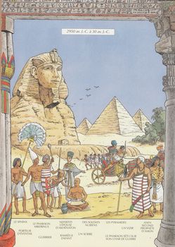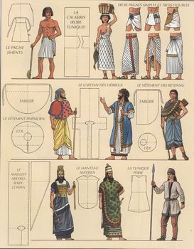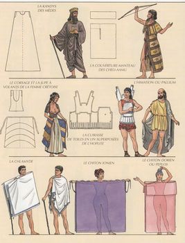 remarques: | chronologie des costumes antiques de 4000 B.C. à 320 B.C. pour les peuples Sumériens, Phéniciens, Assyriens, Egyptiens, Juifs, Grecs et Macédoniens récits et illustrations basées sur les ouvrages: - dictionnaire des antiquités Daremberg et Saglio - Racinet, Hothenroth et Osprey 1) costumes de l'Egypte: Ancien Empire, Moyen Empire et Nouvel Empire, les dieux de l'Egypte et les ennemis de l'Egypte: les Hyksos et les Hittites n.b. période égyptiennes: - Ancien Empire 2778 à 2065 BC - Moyen Empire 2065 à 1580 BC - Nouvel Empire, Basse Epoque 1580 à 332 BC 2) Cananéens, Philistins, Hébreux, Mésopotamiens, Arabes, Mèdes et Perses 3) Crète, Cyclades, Mycènes, Troie, Grèce archaïque, Grèce classique, Grèce hellénistique, sous Alexandre le Grand, dieux et héros grecs, + en annexe: brochure panorama de l'Antiquité (Egypte, Mésopotamie, Grèce et Rome) >> un album documentaire d'un nouveau genre, intéressant mais un peu répétitif il y eut encore 2 autres tome dans cette série: tome 2 (2000) et tome 3 (2002), non collectionnés ici n.b. à ce sujet, voir les magnifiques albums de Fred et Liliane Funcken Annexes - couverture de l'album - planches explicatives sur la tenue des costumes planche 1 - Egypte: le pagne et la robe calasiris, - le tablier phénicien et le cafetan chez les hébreux, - le manteau assyrien et la tunique perse planche 2 - la kandys des Mèdes et la couverture-manteau des Cheli-Aamu - corsage et jupe à volants de la femme crétoise et la cuirasse de l'hoplite ainsi que le pallium grec - la chlamyde ionien ainsi que le chiton ionien et dorien + une image de la brochure panorama de l'Antiquité (ex libris) |