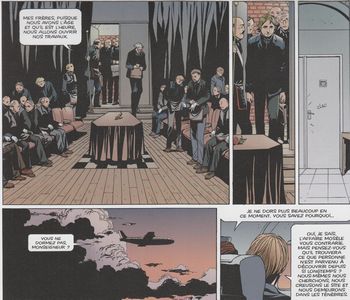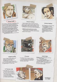 remarques: | réédition septembre 2005 (octobre 2000) dessinateurs: Falque, Gine, Stalner et Wachs poursuite de l'enquête de Didier Mosèle avec son amie Josiane Marlane et avec l'aide du franc-maçon Hertz de la Première Loge, premiers affrontements avec les gardiens du sang dans la forêt où se trouve la statue du cathare et la chapelle des Templiers qui sont situés au coeur du triangle épisode du passé: l'histoire des Cathares de Montségur le récit: 1/ la poursuite de l'enquête (dessinateur Gine) entretemps Didier Mosèle est contacté par Ernesto Pontiglione, un ami de Francis Marlane à Rome qui veut entretenir Didier d'un sujet concernant Francis tandis que Didier continue son enquête sur le lieu où serait le tombeau du Christ >> p. 3 les reliquats de Martin Hertz Francis avait découvert la statue du Cathare (mentionné dans le testament du fou) situé au coeur de la région des Templiers (en Champagne près de Troyes) >> p. 8 la statue du Cathare surnommé "l'homme vert" entretemps la maison de Hertz est assaillie par les gardiens du sang (une confrérie occulte rattachée au Vatican), Hertz réussit à repousser ses agresseurs, mais sa femme Lea est gravement blessée et le pape veut régler cette affaire avant de mourir! >> p. 17 le but des gardiens du sang: effacer la tombe du Christ de la surface de la terre pour ne pas faire éclater la vérité et à nouveau un comportement étrange de Hertz alias Orient-Origine >> p. 21 rue Puteaux, siège de la Grande Loge de France: Hiram = architecte de Salomon, Didier récupère un des carnets rouges de Francis par le biais de son ami de Rome (Pontiglione) Hertz travaille pour le cardinal Montespa qui contrôlerait aussi les gardiens du sang entretemps, Didier et Josiane Marlane se rendent à Courtéranges, par la même occasion on apprend que Josiane est la maîtresse de Didier (déjà du temps de Francis vivant) >> p. 27 la statue du cathare et la chapelle sont découverts >> p. 28 le sceau des Templiers: deux cavaliers sur une unique monture mais les deux comparses sont à nouveau victimes d'une agression par les gardiens du sang et secourus in extremis par Hertz qui les avait suivis >> p. 33 définition du cigare par Hertz "délicat, sensuel et suave" b) visite dans le passé, la suite des péripéties du livre "le testament du fou" (by Stalner) le jeune oblat Benoit, qui avait survécu à l'incendie de l'abbaye causé par les sbires de Philippe-Auguste, avait réussi à sauver quelques feuillets originaux du parchemin en langue araméen (l'original du livre "le testament du fou") >> p. 35/36 les critiques des cathares contre la papauté, la naissance du catharisme et de Montségur le parchemin ramené de St-Jean-d'Acre aurait été écrit par le Christ et c'est la confirmation que le vrai Christ n'a pas été crucifié par la suite, le parchemin est remis par Benoit à un maître-scribe qui en fait la traduction et le rend à l'abbaye d'Orbigny dont le prieur le confie à Benoit pour qu'il le remette au seigneur de Montségur (un parent du prieur), ensuite le seigneur de Montségur transmet ce secret aux cathares qui deviendraient après coup des francs-maçons mais le maître-scribe en avait fait une copie qu'il - pris de remord - remet à l'Eglise qui recherchera par tous les moyens de récupérer et de détruire ce parchemin original les cathares prennent alors Jean l'Evangéliste, successeur de Jésus, comme patron en décembre 1243, Montségur est assiégé et ses occupants exécutés mais quatre frères cathares réussissent à s'enfuir avec le parchemin (ce sera le trésor des cathares) et à trouver refuge auprès des Templiers, une étrange boucle de l'histoire car ceux-ci regrettaient l'action menée par leurs prédécesseurs à l'abbaye d'Orbigny le Christ n'est pas celui qu'on croit et la quête de Didier se poursuit avec à ses côtés un Hertz qui connait beaucoup de choses mystérieuses dernière page (by Wachs): le vrai Jésus n'était pas mort en Palestine, il est recueilli par sa femme et son fisl et doit quitter Jérusalem pour ne pas être traqué parce qu'il pense que son frère n'assumera pas son rôle (n.b. en effet, on se demande comment celui-ci se comportera devant Pilate et le Sanhédrin) >> la quête se poursuit, toujours aussi ésotérique, mystérieuse avec quelques rebondissements mais toujours aussi avec un certain intérêt annexes - couverture de l'album avec la fameuse statue du cathare "l'homme vert" - liste des principaux personnages impliqués dans la série - deux extraits de l'album |