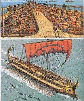 remarques: | histoire de la marine antique depuis 3500 BC à 325 B.C. 1) EGYPTE voyage des pharaons vers le pays de Pount (Ethiopie, Somalie, canal reliant le Nil à la Mer Rouge) 2) MESOPOTAMIE villages flottants sur le Tigre et l'Euphrate, les expéditions de Sennacherib vers 700 BC 3) CRETE première marine célèbre créée par les Minoens lors de laquelle on commença à parler de la Thalassocratie = état possédant la maîtrise des mers 4) les grands explorateurs antiques de légende: - Jason et les Argonautes, l'odyssée d'Ulysse, - Hannon le Carthaginois l'explorateur des côtes de l'Afrique, - Pythéas le Marseillais qui arriva jusqu'à Albion (Angleterre) et jusqu'au pays de Thulé (Norvège) 5) la trière grecque avec un éperon de bronze et 3 rangs de rameurs, commandée par le triérarque >> album très intéressant avec de superbes illustrations annexes - couverture 1er plat (trière athénienne) - couverture 4ème plat - vues sur la trière athénienne |
