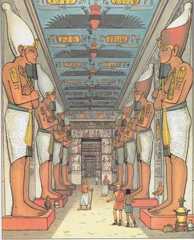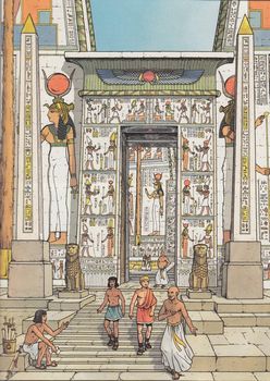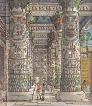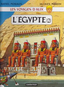 remarques: | 2ème volet sur l'Egypte avec les sites de 1) ABOU SIMBEL temples de Ramses II et de Nefertari (son épouse) 2) PHILAE avec le temple d'Isis sur l'île de Philae 3) KOM OMBO temple double dédié à Haroeris (dieu solaire à tête de faucon) et à Sobek (dieu aquatique à tête de crocodile) 4) EDFOU grand temple d'Horus, protecteur du pharaon 5) ESNA temple de Khnoum, le dieu bélier 6) MEDINET HABOU temples dits des "millions d'années", c'étaient des monuments funéraires (mémorials) 7) DEIR EL BAHARI triple temple dédié aux pharaons Montouhotep III, Thoutmosis III et à la reine Hatchepsout ainsi qu'aux dieux Hathor et Anubis >> à nouveau un très bon album tant pour le récit que pour les illustrations annexes - couverture de l'album (le grand temple de Ramsès II à Abou Simbel) - vue intérieure du grand temple avec les huit colosses osiriaques coiffés à gauche de la couronne blanche de la Haute-Egypte et à droite de la double couronne de Haute et Basse-Egypte (le pshent) - entrée du temple d'Isis sur l'île de Philae - la salle hypostyle du Pronaos qui précède le sanctuaire (temple d'Edfou) |