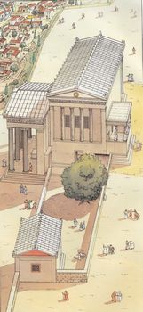 | remarques: | 3ème volet sur la Grèce antique, centré principalement sur Athènes avec description - du Parthénon avec sa statue d'Athéna Polias - de l'Erechtheion avec sa particularité d'avoir des statues de jeunes filles (les Caryatides) au portique sud du temple - du théâtre de Dionysos - de l'Agora = centre de la vie politique et commerciale - fortifications et ruelles d'Athènes dont les poteries étaient très réputées - la Pnyx, colline d'Athènes d'où les politiciens haranguaient la foule - le Pirée, le grand port d'Athènes avec ses Longs Murs n.b. - les Panathénées étaient les fêtes des Athéniens pour honorer leur déesse protectrice Athéna c'est grâce à l'historien et géographe grec Pausanias vivant vers 200 A.C. que l'on doit nombre de détails historiques sur l'Antiquité, car ce fut aussi un grand voyageur qui visita presque tout le monde antique >> album toujours très intéressant, les illustrations sont toutefois un peu moins étudiées que les précédents deux albums sur la Grèce (ceci dû peut'être au changement de dessinateur Laurent Bouhy qui participe aussi à la série des monuments historiques, 5 albums 1985-1987) annexes - couverture de l'album - vue aérienne de l'Erechthéion - Le Pirée et les Longs Murs |