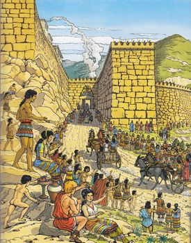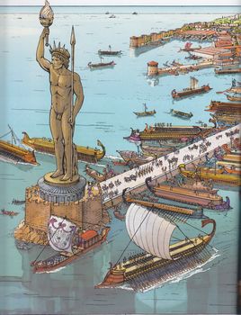 remarques: | 2ème volet sur la Grèce Antique avec la description des villes de: a) Cnossos, célèbre pour son palais, sur la civilisation minoenne et où les jeux tauromachiques ont commençé (le taureau étant en Crète un animal sacré) b) Corinthe, ville riche et culturelle connue pour son temple d'Apollon et pour ses courtisanes sacrées c) Lindos sur l'île de Rhodes d) Mycènes = cité-forteresse avec sa célèbre Porte aux Lions e) Priène en Asie Mineure, exemple du système urbanistique mis au point par Hippodame de Milet f) Rhodes avec sa célèbre statue d'Apollon = le colosse de métal érigé à l'entrée du port et construit par Charès de Lindos g) Selinonte = cité importante en Sicile h) Troie, cité mythique construite vers 3000 B.C. appelée Ilios par les grecs et parfois considérée comme l'Atlantide de Platon >> un album à nouveau très intéressant et très bien illustré annexes - couverture de l'album - vue générale du palais de Cnossos en Crète - vue générale de la célèbre porte aux lions de Mycènes - le colosse de Rhodes (= Apollon) à l'entrée du port - vue aérienne de la mythique cité de Troie à l'époque d'Homère |