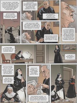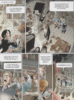 remarques: | réédition octobre 2005 (novembre 2001) dessinateurs: Falque, Gine, Jusseaume et Wachs résumé: au Vatican, le pape à la veille de sa mort demande d'activer les recherches sur le tombeau du Christ qui serait la preuve de l'existence du vrai Christ. Hertz sort de leur cachette l'original du testament du fou et l'anneau pour ouvrir le tombeau, mais ne peut pas en expliquer le sens car les gardiens du sang frappent à nouveau en incendiant la fameuse bibliothèque de Hertz qui est complètement détruite avec l'original du testament du fou, seul subsiste l'anneau à voir: la fameuse bibliothèque dessinée sur la couverture de l'album épisode du passé: l'histoire du franc-maçon Constant 1/ l'Evangile oublié (dessinateurs Falque + Gine) >> p. 4 les cauchemars de Jean-Paul XXIV et les cardinaux qui attendent la mort du pape et dont le successeur pourrait être le cardinal Montespa qui contrôlerait maintenant les gardiens du sang qui ont échappé à l'autorité du cardinal de Guilio >> p. 9 apparition du mystérieux protecteur/informateur/messager entretemps Didier Mosèle poursuit la quête pour le tombeau du vrai Christ avec son secret déposé dans le tombeau et qui serait la preuve irréfutable du vrai Christ et la clef de l'énigme, mais les gardiens du sang espionnent toujours Hertz et vont lui tendre un piège pour le supprimer lui et ses amis dont l'abbé Jacques à qui Hertz veut confier le livre du "testament du fou" ceux-ci se rassemblent dans la villa de campagne de Hertz n.b. Jean Baptiste et Jean l'Evangéliste, les deux patrons de la franc-maçonnerie qui protègent le tombeau du Christ, il n'y aurait donc pas eu de résurrection par Jésus entretemps le bureau de Didier Mosèle est visité par un inconnu qui aurait accès à la fondation Meyer alors que les gardiens du sang avec un mystérieux monseigneur qui dirige maintenant la loggia des gardiens du sang mettent leur plan en action >> p. 15 on utilise encore des disquettes avec les ordinateurs et qui est le mystérieux cambrioleur/messager qui utilise la carte électronique de Francis Marlane? Martin Hertz montre à ses amis l'original du "testament du fou" ainsi que l'anneau qui sert à ouvrir le tombeau, il leur explique qu'il est le dépositaire de la loge première dont le premier fondateur fut le vrai Christ, que cette loge existe toujours et qu'elle va bientôt intervenir contre les gardiens du sang pour l'instant, Hertz leur relate l'histoire du frère Constant, son prédécesseur >> p. 24 la tombe pré-datée de Lea et Martin Hertz >> p. 26 la biliothèque souterraine secrète et exceptionnelle de Hertz, sa matrice >> p. 27 un peu trop sûrs d'eux, Hertz et ses amis! 2/ 1864, l'histoire de frère Constant (dessinateur Jusseaume) frère Constant a été torturé par les gardiens du sang (déjà eux!) pour qu'il leur révèle la cachette du livre "le testament du fou" mais il n'a rien dit tout comme Hiram, l'architecte de Salomon, qui avait été torturé pour la même raison! Napoléon III serait mêlé aux agissements de la loge première "Origine Orient" et aurait informé le Vatican sur la loge première qui détient le livre d'où l'agression sur frère Constant >> p. 40 la mort de frère Constant dans les bras du Baptiste! >> p. 42 la cachette du livre et de l'anneau = la tombe pré-datée de Lea et Martin Hertz mais profitant de leur réunion dans la bibliothèque, les gardiens du sang font exploser la maison de Hertz et mettent le feu à la bibliothèque dont tous les livres sont détruits y compris celui du "testament du fou" seul l'anneau pourra être récupéré nos amis réussissent à s'enfuir par une sortie secrète, mais l'abbé Jacques y laisse sa vie >> la suite de la quête sans fin, pas de nouveaux rebondissements, un album quelque peu répétitif qui fait accentuer le suspense mais le tout reste acceptable avec une jolie couverture d'album |