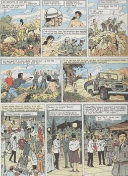 remarques: | l'action se passe cette fois dans la petite république de San Larco (= Monte Carlo) où Julia Manfredi, fille de l'ingénieur Manfredi qui a découvert une magnifique fresque gothique dans une grotte a été assassiné par des requins immobiliers dirigés par le milliardaire Fisher (>> voir l'ouragan de feu) qui veut ignorer et détruire cette fresque pour y construire de grands projets immobiliers et Manfredi, menaçant de tout révéler, a été éliminé pour cette raison sa fille demande l'aide de Lefranc alors que Fisher recrute à nouveau Axel Borg pour lutter contre Lefranc, mais coup de théâtre, Borg se retournera contre Fisher et prend la cause de Lefranc, mort de l'inspecteur Renard à la fin du récit (bien qu'on ne sait pas trop ce qu'il y faisait) alors que Fisher et Axel Borg prennent la fuite et que Lefranc règle son compte avec un petit voyou n.b l'alun = type de composé chimique >> un récit tout juste intéressant avec à nouveau un bon graphisme de Chaillet n.b. dans ces dernières aventures, Axel Borg est toujours bien intentionné envers Lefranc (décidément les bonnes manières d'antan se perdent) et Jeanjean toujours absent tandis que Lefranc quitte avec grand regret la chère Julia Manfredi >> p. 43 qui dévoilent ses seins au service de Lefranc |