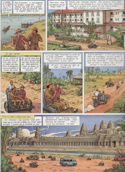 remarques: | album à nouveau édité par Casterman, avec Christophe Simon qui remplace Gilles Chaillet, le 4ème plat redevient celui de Casterman, mais les pages de garde Dargaud subsistent Lefranc en Asie du Sud Est (Cambodge, Angkor) pour retrouver le fils perdu d'une richissime femme d'affaires, cette colonne de secours sera toutefois un piège pour Lefranc qui sera capturé et forcé à éliminer le fils tout en étant filmé pour faire croire à un crime commis par Lefranc, heureusement, il en réchappera grâce à l'intervention d'Axel Borg et pourra démasquer la femme d'affaires qui voulait éliminer son fils cadet pour favoriser son fils aïné >> p. 5 Jocelyn, le maître d'hôtel (au féminin = Jocelyne) >> p. 7 le Handley-Page HP 42 (1938) = avions long-courriers biplans quadrimoteurs britanniques, conçus en 1928 par Handley Page pour Imperial Airways >> p. 9 formation de la colonne (expédition) pour Angkor >> p. 13 les cigarettes Alain Delon >> p. 18 rester dans la colonne pour éviter les mines >> p. 30 les singes qui font l'échelle pour se baigner >> p. 35 Axel Borg armé d'un super laser >> p. 40 le colonel James Bong qui louche, c'est louche! >> p. 44 la côte cambodgienne féérique alors qu'on voit à l'horizon les images d'un port tout sauf féérique, toutefois les illustrations sur Angkor et autres temples du Cambodge sont assez bien effectuées >> une BD touristique sans grand intérêt avec une petite affaire policière à la clé et un récit à nouveau parsemé de remarques stupides, tel en page 40 avec le colonel James Bong qui a perdu ses lunettes de soleil dans la jungle et qui ordonne à ses soldats d'aller les retrouver le graphisme de Simon respectable n'arrive toutefois pas à la hauteur de celui de Chaillet c'est avec cet album que commence le carrousel des dessinateurs pour les albums de Lefranc dont les aventures deviennent de moins en moins intéressantes |