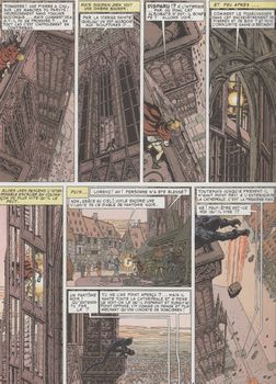 remarques: | - sombre histoire de vengeance autour de la cathédrale de Strasbourg (le fantôme noir de la cathédrale) et rivalité entre deux familles voisines en Alsace: (les Lutzelburg et les Rathsamhausen), avec le couvent de Saint-Odile (patronne de l'Alsace) contre l'évêque de Strasbourg, le sinistre Guillaume de Diest - heureusement grâce à Jhen, tout rentrera en ordre et celui-ci pourra rejoindre Gilles de Rais qui fait mander Jhen par son chanoine Eustache Blanchet >> p. 32 que voici doux poutounets (seins, douceurs) beaucoup plus beau que gargamelles (gosier) de vilaines garcettes (vieilles femmes) décrivant les deux brigands qui agressent la jeune Clara >> récit intéressant mais un peu plus faible que les précédents, toutefois le graphisme de Pleyers reste de bonne fracture |