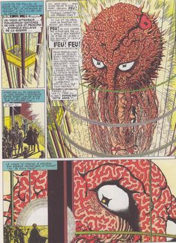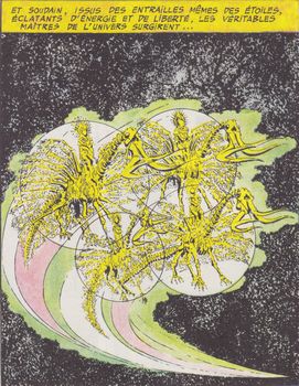 remarques: | un fantastique récit de science-fiction, l'exode du peuple Zor en transformant leur lune IA en un gigantesque vaisseau spatial, mû par la force psitique de OO (= omniscient ordinateur contrôlé par les Dieux de l'Univers = les Etres de Lumière), le combat des êtres de lumière contre les êtres du néant durant le vol, des révolutionnaires troïkas essayent de s'emparer du navire et détruisent en partie 00 qui prend la fuite hors du vaisseau spatial en errant sans but, l'énergie étant à peine fournie par l'énergie KI inventée par le prof Sial, mais qui se révèle insuffisante pour assurer la bonne marche du navire spatial les révolutionnaires sont toutefois éliminés sauf leur chef la traîtresse Mura qui réussit à s'enfuir et en plus des extra-zoriens (les androïdes-humanoïdes GOGS) essayent maintenant de prendre le contrôle du peuple zorien, >> un récit intéressant et plein de suspense quoique parfois un peu complexe à suivre le développement, mais surtout un superbe graphisme avec un coloriage bien effectué |