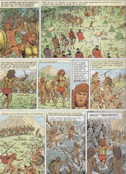 remarques: | 2ème album de la série par J. Martin et unique album édité par Orix (éditeur peu connu, appartenant à Dargaud qui continuera la série) - Orion à Eleusis où il apprend l'histoire du vieux roi Lykus de Pylos dont la fille a été violée par un lion et qui a mis au monde des hommes-lions >> p. 14 Lykus, le père des pères - Orion retrouve Hilona chez les hommes-lions et entreprend de rallier ceux-ci à la cause d'Athènes pour combattre les spartiates, mais à nouveau Périclès trahira Orion et et avec les spartiates éliminera le peuple des hommes-lions, mort tragique aussi de Hilona, seul Sorg, le jeune homme-lion, survivra et partira pour l'Egypte avec Orion, >> une aventure un peu abracadabrante mais le graphisme de Martin est toujours bien soigné (à noter que les pages 31 à 48 ont été terminées par le dessinateur Christophe Simon) |