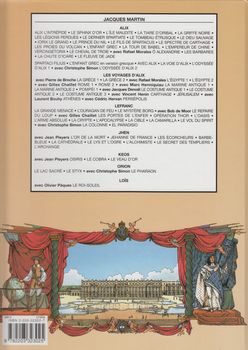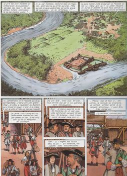 remarques: | début d'une nouvelle série au scénario encore de Jacques Martin avec Olivier Pâques au graphisme - 1682, Versailles, la cour de Louis XIV où le jeune artiste Loïs Lorcey se voit confié la charge de faire des croquis pour le roi sur les us et coutumes concernant les habitants des Indes Occidentales en Louisiane (Nlle Orléans, fort Saint-Esprit) et retour à Versailles avec trois indiens de la région - Loïs recoit un château comme récompense, mais une nouvelle mission l'attend déjà de la tribu des Natchez >> un scénario très naïf, un Louis XIV bon enfant, un graphisme acceptable, surtout pour les couleurs qui montrent une cour du roi rutilante avec beaucoup de rubans et de froufrous - vraiment pas encore de quoi s'enthousiasmer sur cette série, à part peut'être les navires à voile assez bien dessinés à noter >> p. 22 les feuillées = tranchées destinées à servir de latrines aux troupes en campagne, aux campeurs dont Loïs ne veut bien sûr pas faire de croquis >> p. 24 le sergent qui pisse sur ses gens depuis les remparts >> p. 41 les indiens Natchez frustrés de voir les courtisans qui font leurs plus pressants besoins dans les escaliers du château de Versailles annexes - 1er et 4ème plat - page de garde - fort Saint-Esprit |