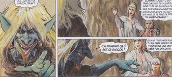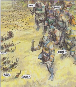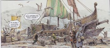 remarques: | sur les traces des ravisseurs d'Aniel, Thorgal est capturé par les hommes de Sourkov qui a été trompé par les magiciens rouges, il les convaincra de son innocence et prendra même le géant Petrov comme équipier dans sa quête pour Aniel pour Jolan, la prochaine épreuve consiste à cueillir la pomme d'éternellle jeunesse dans le jardin de la déesse Idun, une amie fidèle de Vylnia, afin que l'ex-déesse Vylnia chassée par Odin puisse conserver sa vie éternelle (ainsi peut'être aussi que Manthor) mais pour cela, Jolan devra affronter Loki et son armée, c'est pour cela que Manthor confie à Jolan l'armée de poupées en fer et en chiffons mais d'esprit guerrier (l'armée qui vit) >> p. 11 l'utilisation du bouclier de Thor pour traverser le déluge de feu qui conduit à Asgard et qui permet de voyager sans contrainte de temps, toutefois Jolan ne sera plus accompagné de ses camarades qui seront maintenant soumis à d'autres épreuves d'initiation par Manthor >> p. 12 Jolan dans son armure de chef d'armée après avoir traversé le déluge de feu, Jolan et son armée continuent leur marche, mais Loki a déjà été prévenu et séduit la femme de Thor pour s'emparer de sa chevelure blonde afin de tromper la déesse Idun >> p. 17 le dieu Loki, le fourbe, à la chevelure rouge vif >> p. 22 le charme de la déesse Idun pour Jolan >> p. 24/25 la confrontation entre Loki et Jolan de son côté, Thorgal arrive à un port à la frontière du pays du froid avec la compagnie de Petrov qui l'aide à se débarrasser de brigands, alors que les ravisseurs d'Aniel ont continué leur voyage avec un bateau-sabre en prenant la direction de Bag Dadh, la cité des Dji Hins >> p. 34 vive l'amitié et le commerce libre pour Jolan, son armée de poupées doit maintenant affronter l'armée des géants de Loki, les géants son écrasés mais Loki, par ruse, réussit à s'emparer du bouclier de Thor, s'en suit l'intervention de Thor qui protège Jolan tout en récupérant son bouclier, apparition aussi du jeune dieu Vigrid qui somme tous les protagonistes de comparer devant le tribunal d'Odin >> p. 43 Odin ordonne le jugement suivant: a) de pardonner à Vylnia et de lui permettre de revenir à Asgard b) de renvoyer Jolan chez Manthor avec le cheval Pégase c) de garder lui-même l'armée de Jolan créée par Vylnia d) d'exiler Loki dans l'espace pour 5000 lunes le jugement d'Odin qui pardonne à Vylnia et qui punit sévèrement Loki, mais Jolan doit retourner chez Manthor sans la pomme qui sera donnée directement par Odin à Vylnia tandis que Thorgal et Petrov embarquent sur un bateau-sabre muni d'un brise-glace pour naviguer dans les mers gelées >>> cet album consacre à nouveau une grande part du récit à la mythologie nordique, un scénario toutefois bien réussi par Sente et un graphisme de bonne fracture par Rosinski avec une jolie couverture d'album >>> fin de la première partie des aventures de Jolan, les deux prochains albums continueront les péripéties de Thorgal à la recherche d'Aniel, début de la série parallèle de Kriss de Valnor annexes - couverture de l'album - Loki, le mauvais dieu - la bataille entre nains et géants - un bateau-sabre |