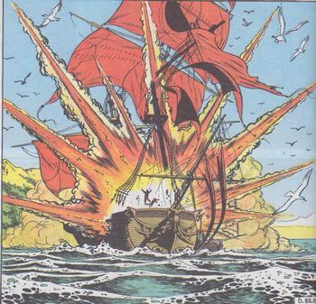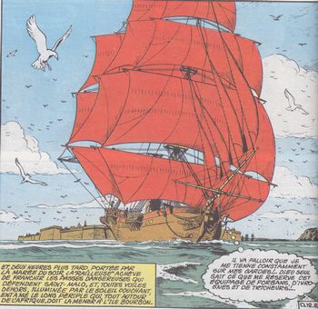 remarques: | Eric quitte Barbe-Rouge et sous une autre identité pour le compte des armateurs Kermadeu de Saint-Malo, prend le commandement du navire "la Railleuse" avec une cargaison pour les Indes, il est accompagné par deux filous: le second Pierre l'Olonnais et son assistant le jeune noble breton De Gevezon qui découvriront la vraie identité d'Eric et soulèvent l'équipage contre lui, on veut le pendre comme pirate mais à ce moment, le navire est attaqué par des pirates maures Eric est capturé et vendu comme esclave à Alger où il fait la connaissance d'Aïcha, la soeur de Baba, qui l'aide à s'enfuir, mais rentré en France, il est incriminé par les fausses accusations du breton De Gevezon, miraculeusement rescapé de la bataille contre les pirates les accusations de Gevezon sont contrecarrées par le mousse d'Eric, également rescapé, malgré tout Eric est aussitôt condamné comme fils de pirate par la justice du roy à 20 ans de galère, Eric lance alors un défi au roy, un défi à l'injustice >> p. 47 les idées d'Eric commencent à rejoindre celles de Barbe-Rouge >> un très bon album tant pour le scénario que pour le graphisme, couverture peu remaniée par rapport l'édition originale, 48 pages, page de garde au voilier par contre, cet album contient plusieurs anachronismes: >> p. 3 on se réfère à l'épisode précédent "le capitaine sans nom" qui n'a pas encore été publié en album et qui ne le sera pas, le titre étant "le fils de Barbe Rouge", l'album précédent ne paraîtra qu'en 1981 sous le titre "le jeune capitaine" >> p. 5 on se réfère ici à l'album "le roi des 7 mers" qui ne correspond pas à ce titre, mais au "capitaine sans nom" paru sous le titre "le jeune capitaine" d'où désarroi pour le lecteur qui ne trouve pas ce passage dans le roi des 7 mers >> et en dernière page 48, le prochain album est annoncé avec "le fils de Barbe-Rouge" qui est en fait l'album précédent, le prochain étant "les révoltés de l'Océane" et le "roi des 7 mers" est toujours listé en 8ème position au 4ème plat (réédition 1990) par contre, le 4ème plat de l'édition originale de 1964 mentionne bien les trois premiers titres dans l'ordre:le démon des Caraïbes, le roi des 7 mers et le fils de Barbe-Rouge (sans bien sûr mentionner le capitaine sans nom en 3ème position) une chatte n'y retrouverait plus ses petits annexes - 1er plat 1990 et 1er plat 1964 - la "Railleuse" vivante et morte |