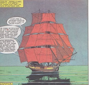 remarques: | c'est maintenant une lutte à mort entre Eric et Moralès pour la découverte du trésor de Morgan, mais grâce au plan ramené par Triple Patte, Eric a l'avantage et après avoir reconquis son navire "le faucon noir", Eric navigue plein sud vers le Cap Horn >> p. 9 la carte du trésor tatouée sur la poitrine de Baba >> p. 11 la magnifique voilure du Faucon Noir, toutefois Eric n'a pas pu empêcher Morales d'équiper un navire "l'Epervier" pour se lancer à sa poursuite après avoir affronté de dures tempêtes et le froid, Eric arrive dans les parages du Cap Horn où son navire est victime des naufrageurs fuégiens (Terre de Feu), il réussira à s'en sortir et même à s'emparer d'un naufrageur qui le guidera jusqu'à l'île de l'homme mort >> p. 22 la force exceptionnelle de Baba >> p. 25-27 à la merci des naufrageurs et après bien des recherches, Eric et ses hommes découvriront le trésor de Morgan caché dans une grotte de l'île >> p. 31 errare: on est vers 1750 et le parchemin est daté de 1850 >> p. 42 la découverte du trésor mais à leur retour, ils tombent aux mains de Morales qui arrivé entretemps sur les lieux, a capturé le Faucon Noir sur le point d'être pendus, nos amis sont sauvés par l'apparition subite de Barbe Rouge sur un navire puissamment armé qui délivrera son fils après avoir abattu le couard Moralès >> p. 48 les explications de Barbe-Rouge sur sa résurrection Barbe-Rouge et son fils partiront toutefois chacun de leur côté, Eric ne voulant toujours pas devenir un pirate, Barbe-Rouge récupère son navire "le Faucon Noir" tandis que Eric reçoit le navire sur lequel Barbe-Rouge était intervenu >> à nouveau un bon récit d'aventure, de navigation et de chasse au trésor, un graphisme bien exécuté avec de jolies couleurs, mais une fin quelque peu précipitée n.b. il est mentionné que Paape a participé au graphisme de cet album, mais on ne peut guère le distinguer dans les dessins annexes - la couverture de l'album - une magnifique voilure |