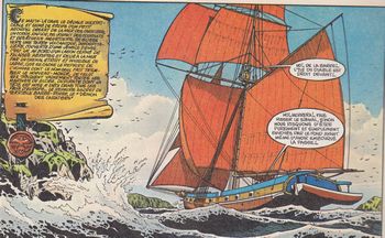 remarques: | à Carthagène, grâce aux informations d'un ancien marin de Barbe-Rouge, on cherche à attirer celui-ci dans un piège en voulant capturer Eric, ce qui déclanchera la réaction de Barbe-Rouge qui voudra venir délivrer son fils entretemps, Eric, sur son nouveau vaisseau "la Marie Galante", sauve de la noyade, dona Dolorès Guzman de Peralda y Almontès, duchesse d'Albenga et nièce du vice-roi des Indes Occidentales à Carthagène, qui allait rejoindre son fiancé, Don Enrique, fils du gouverneur de Carthagène Eric, malgré les avertissements de Triple-Patte, accepte de reconduire dona Inès à Carthagène, mais lors de la rencontre avec le fiancé de dona Inès, Eric reconnait son ancienne connaissance (>> voir l'album le démon des Caraïbes) et ce qui devait arriver arriva, Don Enrique reconnait Eric et par ruse fait arrêter Eric et ses compagnons par les troupes du gouverneur, toutefois Baba le noir réussit à s'échapper et sur un radeau va tenter d'avertir Barbe-Rouge, malheureusement, Paco, un espion des espagnols se met aussi en route pour tromper Barbe-Rouge et l'attirer fermement dans ce traquenard, ce sera le piège espagnol de son côté, dona Inès qui a été scandalisée par l'arrestation de son sauveur, >> p. 15 une âme pure parmi les chacals réussit à faire parvenir à Eric une lime qui lui permet de scier ses chaînes et de délivrer ses compagnon enfermés dans une tour du port de Carthagène avec beaucoup de chance, Eric parviendra même à récupérer son navire "la Marie Galante" et à prendre le large, mais parviendra-t-il à prévenir son père adoptif du danger qui le menace? >> un album au scénario à suspense avec des pièges bien imaginés et un graphisme toujours impeccable, la fuite d'Eric est improbable mais pas impossible |