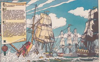 remarques: | Eric, sur le Seeadler rebaptisé "l'Epervier", se morfond à la Nouvelle-Orléans; alors que la guerre fait rage entre la France et l'Angleterre, Eric reçoit la mission secrète de ravitailler Fort-de-France en Martinique assiégée par la flotte anglaise, à cet effet, Eric est reconnu par le roy et reçoit une "lettre de course" >> p. 4 la différence entre pirate et corsaire toutefois, pour sortir du delta de la Nouvelle-Orléans, Eric doit forcer le blocus de la flotte anglaise et malgré un espion anglais infiltré dans son équipage, le corsaire Eric réussira par une nuit de brouillard à se faufiler à travers la flotte anglaise, mais l'espion se démasque et parvient à avertir une frégate anglaise qui tente d'arrêter la course de l'Epervier en l'éperonnant >> p. 29/30 l'éperonnage manqué toute la flotte anglaise se lance alors à la poursuite de l'Epervier, mais pour la dérouter l'Epervier prend une autre direction; averti par un évadé, Eric décide de délivrer des marins français emprisonnés dans le bagne de Matagorda (Nouvelle Espagne, actuellement le Texas) qui est dirigé par une ancienne connaissance d'Eric: Don Enrique, fils du gouverneur de Carthagène (>> voir le piège espagnol) la tentative réussit et Eric compte maintenant dans son équipage de solides marins initiés aux combats maritimes reste à forcer le blocus de Fort-à-France assiégée en même temps par la flotte sur mer et par les troupes anglaises sur terre, Eric rebaptise l'Epervier en "the Falcon" et réussit à s'emparer d'un navire ravitailleur anglais "the blue oak" >> p. 42 le premier SOS des Caraïbes (save our souls) Eric utilisera ce navire comme bombe incendiaire (brûlot) dirigée contre le puissant vaisseau de guerre anglais "the Achilleus" qui bloque l'entrée du port de Fort-de-France et Eric comme nouveau corsaire du roi fait une entrée triomphante à Fort-de-France >> à nouveau un album bien conçu parfaitement dans la lignée de la série Barbe-Rouge, toutefois deuxième album sans la participation directe de Barbe-Rouge annexes - couverture de l'album - bataille maritime dans les Caraïbes |