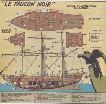 remarques: | résumé sur les péripéties de Caroline de Muratore par hasard, Baba et Triple-Patte capturent le traître Ruggieri et grâce au sauf-conduit trouvé sur lui, nos deux amis parviennent à sauver Eric condamné à la pendaison, mais Ruggieri réussit à s'échapper de sa peu confortable situation Eric réussit à s'introduire chez le duc de Mantoue, mais il doit encore affronter le baron Spada, agent de l'Autriche confrontation à la cour de Mantoue, Spada réussit à s'innocenter, Ruggieri est arrêté, toutefois avec l'aide de Spada reprend la fuite Eric est alors chargé par le vieux duc de négocier pour sa petite fille Caroline une rançon auprès du dey d'Alger, malheureusement la rançon est subtilisée par Ruggieri sans qu'Eric ne s'en aperçoive rencontre à Bordeaux d'Eric avec Barbe-Rouge qui vient d'arriver avec son extraordinaire vaisseau >> p. 27/28 le nouveau Faucon Noir III (3ème du nom), qui est devenu une formidable machine de guerre >> p. 29 les deux fameux canons du Faucon Noir: Gog et Magog (fabriqués dans les fonderies de Liège) >> p. 30 le plan du Faucon Noir III, un superbe vaisseau de guerre, avec une coque effilée, une double voilure et armé de mitrailleuses, super-canons et feu grégeois le Faucon Noir fait escale à Malte où il est retardé par le grand maître à la solde de l'Autriche >> p. 38 le Faucon Noir qui s'échappe après avoir brisé les chaînes gardant le port entretemps, Ruggieri est arrivé à Alger et avec Khaïr-le-More, il prépare un piège infernal à Eric qui arrive tout confiant alors que la belle Caroline a déjà quitté Alger, promise au sultan de Constantinople, le gardien de la sublime porte >> un scénario de bonne qualité avec une machination diabolique (surtout pour les intrigues et les dialogues) et un graphisme impeccable d'Hubinon qui détaille bien les visages des antagonistes, dernier album avec les pages de garde de Pilote |