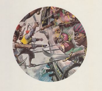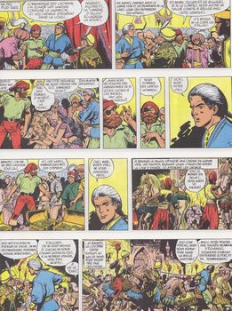 remarques: | le piège de la flotte turque se referme sur le Faucon Noir III, mais Barbe-Rouge prépare encore un coup à sa façon (avec des mines) après coup, le Bahadour est pris d'abordage et capturé mais Caroline n'est plus à bord, elle a été enlevée auparavant par Khaïr-le-More qui la conduit par voie terrestre à Constantinople >> p. 16 la ruse pour faire parler un prisonnier turc, le mettre dans un tonneau rempli de saindoux et de viande de cochon Eric décide alors par ruse d'intervenir directement à la cour du sultan, s'en suit une cavalcade-rigolade durant laquelle le sultan est fait prisonnier et échangé contre Caroline >> p. 27 la partie de rigolade dans le palais de la sublime porte après l'échange, toute la flotte turque se remet à la poursuite du Faucon Noir, le nouveau plan d'Eric consiste à abandonner le Faucon Noir dans le détroit des Dardanelles et de s'emparer de la feluque de guerre "l'Altaïr" du More Khaïr, felouque restée en attente dans le golfe de Saros donnant directement accès sur la haute mer le plan réussit à merveille et avant de quitter le Faucon Noir, Eric y laisse une bombe à retardement qui détruit la flotte turque arrivée à l'abordage et où le More y perd définitivement la vie, ce sera aussi la fin du Faucon Noir, 3ème du nom reste à retourner à Montoue avec Caroline et Ruggieri tenu captife qui sera confondu avec le baron Spada, celui-ci tente alors de prendre la fuite en prenant Caroline comme otage, mais Triple-Patte lui réservera un coup de son pilon >> p. 47 l'arme secrète de Triple-Patte: un fusil camouflé dans son pilon Caroline amoureuse d'Eric lui demande de rester avec elle, mais la vie d'aventures est plus forte et Eric la quitte avec regret >> fin des aventures barbaresques, retour dans les Caraïbes, une fin bien imaginée par Charlier, nouveau graphisme par Jijé (qui a repris la série depuis la mort d'Hubinon), mais qui n'a pas vraiment le style approprié réaliste pour les aventures de Barbe-Rouge, les personnages perdent de leur stature et le dessin devient quelque peu caricatural, la série est éditée maintenant par Fleurus/Edi-3, publication qui ne durera que l'espace de deux volumes, repris après coup par Hachette/Novedi, avec comme nouveau sous-titre "les nouvelles aventures de Barbe-Rouge", nouvelle page de garde et le 4ème plat ne comprend plus la liste des aventures de Barbe-Rouge annexes - 1er et 4ème plat de l'album - la nouvelle page de garde - une planche de Jijé - nouvelle couverture pour la réédition Hachette (1983) |
