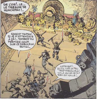 remarques: | Eric et Barbe-Rouge découvrent l'entrée secrète dans la pyramide aztèque et arrivent à la salle du trésor, mais le trésor est piégé, nos amis restant prisonniers de la chambre au trésor qui se remplit d'eau petit à petit entretemps, la troupe espagnole de Don Scarpato a aussi rejoint la cité perdue et se retrouvent attaquée par des guerriers aztèques qui surgissent de nulle part alors que le reste de la troupe de Barbe-Rouge avec Triple-Patte sont assiégée par les espagnols, la cité perdue est devenue un champ de bataille toutefois, les aztèques ne peuvent venir à bout seuls des envahisseurs et décident de s'allier avec Eric et Barbe-Rouge contre les espagnols Eric et Barbe-Rouge sont donc délivrés de leur prison-piège et ensemble avec les aztèques éliminent les espagnols dans un combat épique, les espagnols de Don Scapato doivent faire retraite mais >> p. 41 ils seront décimés par les indios Macumba qui les attendent sur le chemin du retour tout comme Piet Godda qui périt dans les sables mouvants en récompense les aztèques livrent à Barbe-Rouge tout leur trésor contre la promesse de ne jamais révéler leur refuge et de détruire les accès à la cité de la mort sur leur chemin du retour >> p. 37 mission accomplie, mais les aztèques traitent encore leurs alliés de chiens blancs reste à se débarrasser de Morgan et de Concha (alliée maintenant avec Morgan), ce ne sera pas un grand problème, nos amis récupèrent le Faucon Noir et abandonnent le pirate Morgan et sa chère Concha sur une plage du Yucatan fin de l'épisode aztèque >> toujours un bon scénario et un bon graphisme, fin de la série des nouvelles aventures de Barbe-Rouge, la série continuera en deux parties a) la série continuée par Gaty en 1991 avec le prochain album: "pirates en mer des Indes" en collaboration avec le scénariste Ollivier (après la mort de Charlier en 1989) b) une nouvelle série déjà reprise par Pellerin en 1983 et en 1987 qui commencera de nouvelles aventures très bien dessinées, mais qui se distance complètement de la série de Gaty la série de Gaty se poursuivra médiocrement alors que celle reprise par Pellerin donne un essor nouveau et superbe à cette deuxième série, malheureusement Pellerin abandonnera la série Barbe-Rouge au bout de deux albums pour créer sa propre série: l'Epervier annexes - couverture de l'album par Pellerin - la salle au trésor |