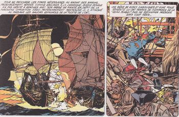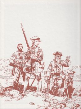 remarques: | l'album comprend une nouvelle page de garde avec le singe maki apparu dans l'album précédent (page 37), toutefois ce maki est une invention particulière à Pellerin qui n'aura eu qu'une brève apparition dans l'album "trafiquants de bois d'ébène" n.b. il y aura toutefois l'apparition d'un singe maki dans les deux premiers albums de Bourgne/Perrissin mais rien à voir avec Eric Lerouge aventures en Jamaïque pour Barbe-Rouge et Eric qui réussiront, à la barbe des anglais, à retrouver les noirs de Mokoteke dont le fils Monga est devenu le chef d'une bande d'esclaves libérés, réfugiés dans les montagnes de l'île (Blue mountaines) >> 9 l'auberge "le cochon et le sifflet" à comparer avec l'auberge à la Tortuga "le cochon qui siffle" en fait la seule chose que Barbe-Rouge craint, c'est la flotte anglaise et ce sera surtout Eric qui dirigera les opérations sur l'île d'abord avec Baba et le nègre Ogoué, neveu de Mokoteke, Eric va contacter Mongo et lui proposer d'embarquer avec ses esclaves sur le Faucon Noir >> n.b. dans ce récit, la chevelure d'Eric n'est plus coiffée avec une queue de perruque pour cela, Eric devra jouer un bon tour aux anglais et déjouer les manipulations de Aesopus, un nain noir, conseiller de Mongo >> p. 33 Aesopus qui lit le livre de Machiavel >> p. 38 un serment anglais à un pirate n'a pas de valeur après bien des mésaventures, Eric réussira à charger tous les noirs de Mokoteke sur le Faucon Noir et à repartir pour l'Afrique après s'être débarrassé de Aesopus Mokoteke est très content et propose à Barbe-Rouge de rester dans sa tribu, mais pour Barbe-Rouge, son seul pays, c'est l'océan et il repart avec Eric vers de nouvelles aventures >> à nouveau un très bon album dessiné par Pellerin, bon scénario, superbe graphisme, excellent coloriage, un des meilleurs albums de la série Barbe Rouge (mais aussi dernier album au scénario de Charlier qui décède en 1989), malheureusement aussi le dernier de Pellerin qui va maintenant se consacrer à sa propre série l'Epervier à noter que cet album présente Barbe-Rouge en médaillon sur le 1er plat annexes - couverture de l'album par Pellerin - les pages de garde avec le maki - une belle vignette de Pellerin |