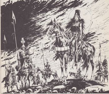 remarques: | le chevalier Roderic avec son compagnon Renaud combattent de concert en Palestine les islamistes de plus, Roderic à Jérusalem doit mettre à l'abri la belle Blanche, fille de maître Urbain, menacée par le pervers Nerses, l'arménien, prêteur sur gage voyage à travers le désert où Roderic et ses amis sont attaqués par une bande de brigands à la solde de Nerses, mais l'apparition de la femme-chevalier Amathea et de ses chevaliers noirs met les agresseurs en déroute >> p. 23 l'apparition spectaculaire d'Amathea, magicienne et princesse de la lune entretemps, les chevaliers du Temple ont assassiné un ambassadeur du Vieux de la montagne qui veut faire la paix avec le roi de Jerusalem Roderic tombe sur les corps des ambassadeurs et récupère le traité de paix signé que les templiers n'ont pas eu le temps de trouver, Roderic décide d'apporter le traité au Vieux de la montagne mais le chemin est long jusqu'à Alamout (forteresse du Vieux de la montagne près de Téhéran) >> une des premières oeuvres de Vance, aventures moyenâgeuses en Terre Sainte, le scénario n'est pas encore très élaboré mais le graphisme est déjà typique pour Vance, bien exécuté en Noir&Blanc Information à distinguer dans ce récit les islamistes de Saladin, les ismaélites du vieux de la montagne, les templiers et les chevaliers du roi de Jerusalem |