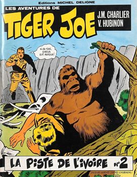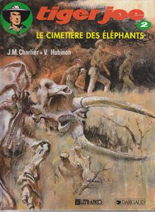 remarques: | l'expédition de Tiger Joe et de Sheila Keeler continue vers les monts bleus, mais nos amis sont arrêtés par des cannibales (des macaques selon Tiger Joe) que celui-ci réussira toutefois à amadouer puis à les dérouter avec des bâtons de dynamite finalement on arrive dans les monts bleus, il faudra encore s'occuper d'un gorille qui enlève Sheila, puis encore se battre contre la bande de Slim Hunter avant d'arriver au cimetière des éléphants, enfin c'est le chemin du retour en laissant un trésor d'ivoire fabuleux derrière soi, mais c'est promis on reviendra le rechercher >>> page 30 même dans les situations difficiles, Tiger Joe n'oublie pas de bourrer sa pipe (d'ailleurs Charlier aime bien dessiner des hommes avec une pipe) >> pas de grand changement ni pour le scenario ni pour le graphisme annexes - couverture de l'album avec comme titre: le cimetière des éléphants - couverture album Deligne 1977 avec comme titre: la piste de l'ivoire - couverture édition Lefrancq 1988 avec comme titre: la piste de l'ivoire |