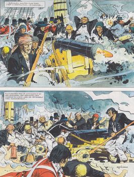 remarques: | Londres dans les années 1800, épopée de la marine anglaise au temps de Nelson, le capitaine Bruce Hawker sur le HMS "Lark" en mission spéciale pour le transport d'une arme secrète vers Gibraltar, mais la mission échoue et Hawker se retrouve prisonnier des espagnols >>> bonne documentation sur les navires de guerre de cette époque, un scénario respectable avec un superbe graphisme et un très bon coloriage annexes - Ier et 4ème plat de l'album - trois superbes illustrations |