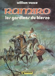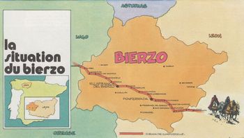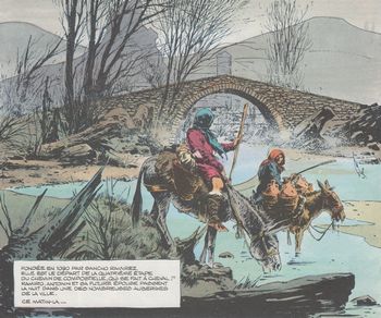 remarques: | introduction: les splendeurs du chemin de Compostelle (2) d'Estella à Mansilla de las mulas dont palais et cloître d'Estella, église de Torres del Rio, Montes de Oca, le monastère cistercien de las Huelgas, Burgos et Sahagun (extraits du guide du pélerin 1969), le chemin en Espagne vers Compostelle étant appelé le chemin français n.b. el Bierzo est une comarque (division territoriale) à l'ouest de la province de León sur la route de Burgos, Ramiro et ses compagnons quittent la Navarre pour entrer en Castille où son père Alphonse VIII l'informe que la Castille a fait maintenant alliance avec le royaume de France >> p. 27 le nom complet de Ramiro Quintana del Nogal Ramiro continue donc sa route avec Amaury de Neuvy devenu son allié, mais ils doivent encore affronter les sbires des moines de Cluny et plusieurs groupes de brigands alléchés par un possible butin, de plus les templiers de Ponferrada ont eu connaissance du secret du breton et se mettent également de la partie Ramiro comme toujours échappera à ses poursuivants et se retrouve sur le chemin de Compostelle, prochain rendez-vous Molinaseca >> scénario respectable et graphisme toujours bien exécuté annexes - Ier et 4ème plat de l'album - carte du Bierzo - pont dans le Bierzo - Ramiro devant son père le roi de Castille, Alphonse VIII |
