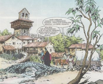 remarques: | tome 5 daté de 1981 mais aventure intermédiaire de Ramiro qui n'a rien à voir avec la série de Compostelle et sans introduction, en fait c'est la suite du tome 1 Ramiro à la recherche de sa mère est fait prisonnier par des brigands qui détiennent sa mère comme otage, un soi-disant charlatan, prisonnier lui aussi, lui offre de payer leur rançon si Ramiro devient son domestique pour un an, en fait le charlatan est chargé par le roi du Leon de s'emparer de Ramiro qui toutefois réussira à s'échapper avec sa mère >> un album hors-série, intercalé (on ne sait pas bien pourquoi) dans la série et reclassé en 2ème position au 4ème plat par l'éditeur lors de sa parution en fait comme tome 5 en 1981, scenario plutôt faible et graphisme moins élaboré annexes - couverture de l'album - portrait du charlatan - deux illustrations bien réussites |