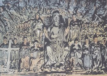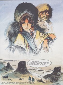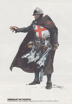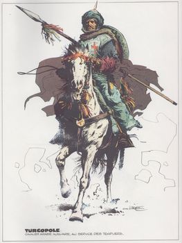 remarques: | introduction (cette fois à la fin de l'album) sur les splendeurs du chemin de Compostelle (3) dont le royaume du Leon = berceau du style roman castillan avec de magnifiques peintures romanes, le panthéon royal de San Isodoro et sa châsse ( = reliquaire), calice et autres trésors, la forteresse des templiers Ponferrada, Villafranca del Bierzo, Puertomarin et Saint Jacques de Compostelle avec sa cathédrale et son fameux portique de la gloire prologue avec résumé car il fallait bien remettre de l'ordre dans les aventures de Ramiro, arrivées au relais de Molinaseca capturés par les templiers, Ramiro et ses compagnons réussissent à s'évader, mais arrivés à Compostelle, ils sont à nouveau recapturés par les templiers, toutefois ceux-ci et les clunisiens ont été dupés, car les vrais compagnons, Antonin et son épouse, ont pris un chemin différent et ont déjà embarqué avec la flotte castillane, tandis que Ramiro accompagnait Amaury de Neuvy et une dame espagnole déguisés en pélerins, les templiers doivent relâcher Ramiro, malheureusement celui-ci apprend que la flotte castillane a été prise dans une tempête durant laquelle Antonin et son épouse ont péri, la Castille n'héritera donc pas de l'Amérique au XIème siècle >> un album assez intéressant qui clôt la série sur le chemin de Compostelle avec à nouveau un superbe graphisme avec des cases plus larges (3 lignées par page au lieu de 4) et un nouveau lettrage, dernier album avec la collaboration de Stoquart annexes - couverture de l'album - un cavalier arabe appelé turcopole (cavalier arabe auxiliaire au service des templiers) - une planche de l'album - le portique de la gloire à St-Jacques de Compostelle - portrait d'un sergent du temple |