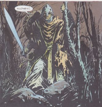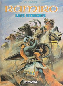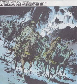 remarques: | pas d'introduction sur les splendeurs de Compostelle pour cet album les 5 chevaliers rattrapent la troupe arabe, mais avant de les attaquer de front, ils vont libérer par surprise trois otages dont la fille d'un des chevaliers, puis la bataille fait rage, les berbères sont défaits et l'un deux révèle à Ramiro que le trésor des wisigoths a été emporté par un autre groupe d'arabes qui ont emprunté un autre chemin >> p. 11 del tiempo de los godos = au temps des goths = au temps jadis (expression encore usitée en Espagne) tout est à refaire et seuls 4 chevaliers (l'un a été gravement blessé) continuent leur route, mais cette fois en territoire ennemi et la poursuite infernale continue >> le graphisme reste d'assez bonne qualité mais le scenario est quelque peu décevant, l'absence de Stoquart se fait peut'être remarquer, car Vance n'excelle pas comme scénariste dans cette suite annexes - couverture de l'album - la charge d'El Chato et ses charognards de grands chemins - le chevalier Ramiro dans toute sa splendeur |