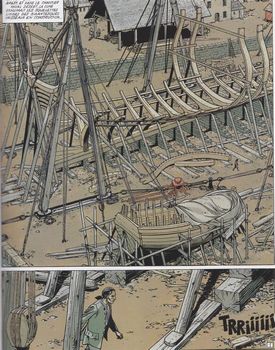 remarques: | Cha-Ka, qui avait réussi à s'enfuir durant la sequestre du bateau de l'Epervier, échappe à la noyade mais arrivé à terre, il est repéré et pourchassé dans le chantier naval de Brest >> p. 3 à 7 montrant de très belles planches sur un chantier naval >> p. 3 la lune exhumait les squelettes livides des gigantesques vaisseaux en construction par ailleurs Hervé de Villeneuve se débarrasse de Morvan, un témoin gênant et fait la cour à Agnès de Kermellec tout en essayant de trouver dans la bibliothèque du comte quelques autres traces pour la chasse au trésor le plan de l'Epervier est de reprendre possession de son bateau et de délivrer son équipage avant l'intervention de l'expédition menée par le marquis de la Motte >> p. 25 l'histoire de l'enfance de Yann qui avait été adopté par le vieux comte de Kermellec et celle de la statuette inca Tlaloc qui sert comme repère pour retrouver le trésor >> p. 26 l'origine de la cicatrice à l'oeil gauche de l'Epervier l'Epervier quitte donc son repaire avant l'arrivée des hommes de La Motte et avec un petit groupe rend inutilisable les canons de fort Camaret qui contrôle la rade de Brest, à cet effet il utilise un sauf-conduit pris sur un des officiers de La Motte, reste à délivrer son équipage et à récupérer son navire >> p. 46 le pavillon de l'Epervier entretemps surpris dans la bibliothèque, Hervé de Villeneuve blesse gravement Agnès de Kermallec >> toujours un graphisme et un scénario très respectable avec quelques épisodes de l'enfance de Yann chez les Kermellec et l'histoire de la statuette Tlaloc qui serait le point de départ d'une chasse au trésor malgré tout le scénario a de la peine à rivaliser avec celui de Charlier |