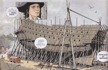 remarques: | l'Epervier nouvelle série Canada, 1742, un trappeur gravement blessé réussit à rejoindre le fort St-Jean et meurt peu après, sur son dos est écrit un message du Chevalier de Talmont qui avertit le roi de France d'un grand péril >> p. 12 altercation à la cour du roi Louis XV >> p. 15 l'histoire du chevalier de Talmont et de sa mission, mais une partie du message, étant codé, reste secret à la cour de Versailles, le roi Louis XV et son ministre de la marine Maurepas confient à l'Epervier le soin de tirer cette affaire au clair, mais le ver est déjà dans le fruit et un complot se trâme contre l'Epervier qui >> p. 21 prétend que Versailles n'est guère plus sûre que les forêts canadiennes >> p. 24 retour d'Agnès de Kermallec l'Epervier reçoit comme guide Villéon, un criminel notoire détenu au fort du Taureau et qui est sensé connaître parfaitement les régions du Canada et ses sauvages >> p. 30 et 32 jolies illustrations sur le fort du Taureau l'Epervier doit appareiller de suite avec son navire "la Méduse" avant que l'hiver débute au Canada, mais après de nombreuses tentatives de sabotage et suite à la trahison de la perfide comtesse de Sévérac, l'Epervier est fait prisonnier par les comploteurs avant de pouvoir appareiller >> p. 40 le navire "Royal Louis" en cours de construction >> le graphisme reste toujours très bon avec de bonnes illustrations sur les voiliers de l'époque, mais le scénario commence à montrer des signes de lassitude avec des actions débordant le cadre de l'histoire et qui font traîner les choses, album de 48 pages avec une nouvelle page de garde, la 2ème page de garde (en fin de volume) présentant la liste des albums publiés sur l'Epervier soit: - 6 volumes pour le premier cycle - un album "archives secrètes" (origine et histoire de l'Epervier) - un album "secrets de tournage" (présentant surtout un aspect technique) - 6 fascicules "les rendez-vous de l'Epervier" - 2 volumes pour le 2ème cycle, un troisième étant annoncé n.b. secrets de tournage et les rendez-vous ne sont pas collectionnés ici |
