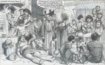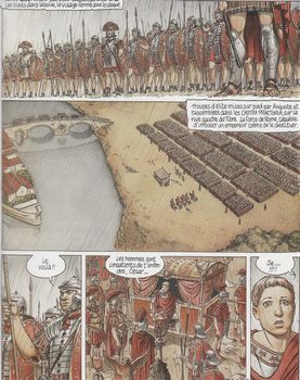 remarques: | 2ème édition Agrippine organise maintenant la montée au pouvoir de son fils Neron qui devient empereur et est accepté comme princeps juventutis (prince de la jeunesse) par la garde prétorienne, d'un autre côté, Britannicus est l'objet de brimades par Agrippine et son homme de main Draxius mais Britannicus est bien défendu par son serviteur nubien tandis que Neron s'occupe d'Acté en l'enlèvant à l'emprise de Pallas quant à Lucius Murena, il quitte son domaine pour se rendre chez son ami Pétrone >> p. 39 l'empoisonneuse locuste se remet au travail le serviteur nubien de Britannicus se rend à l'école de gladiateurs de Bacchus Soroctos pour s'entraîner au combat dans l'arène, il fait la connaissance du cruel Massam alors que Lucius Murena avec l'aide de Petrone recherche les meurtriers de sa mère Lolia Paulina Neron se brouille avec sa mère Agrippine, Britannicus meurt suite à une crise d'épilepsie (peut'être toutefois empoisonné soit par Neron ou par Agrippine, le débat reste ouvert) lors d'un banquet où il s'apprêtait à faire valoir le testament de son père qui deshéritait Agrippine et Neron, ce document lui avait été transmis par Pallas qui n'avait plus les faveurs d'Agrippine et qui désirait se venger, mais ce document brandi par Britannicus lors de sa crise est récupéré par Neron qui le détruit aussitôt, puis Neron demande l'allégeance de Burrhus, chef des prétoriens, rien ne peut plus arrêter sa position d'empereur sauf peut'être sa propre mère >> à nouveau un très bon album, peut'être un peu moins intensif que le premier tome mais toujours très intéressant et avec une superbe couverture citation sur le 4ème plat: son libertinage, sa lubricité, sa profusion, sa cupidité et sa cruauté se manifestèrent d'abord graduellement et d'une façon clandestine, comme dans l'égarement de la jeunesse, et pourtant même alors personne ne put douter que ces vices n'appartinssent à son caractère plutôt qu'à son âge Suetone, Neron XXVI |