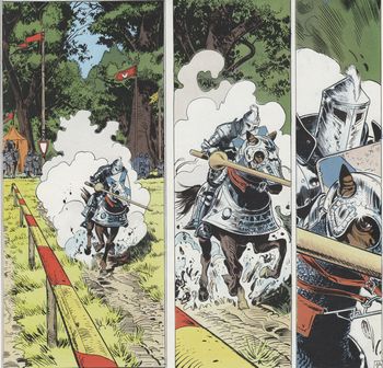 remarques: | Gwen à la cour du roi Arthur échappe à un traquenard des hommes du roi Reynaud grâce à l'aide d'un mystérieux chevalier = Elaine, princesse d'Avalon (l'île des morts), poursuivis à nouveau par les brigands de Reynaud, Elaine fait appel aux 7 seigneurs de Menhau = les chevaux de la nuit à qui Elaine promet d'ouvrir les portes d'Avalon contre leur aide >> une course-poursuite dans forêts et campagnes, aventures assez banales, mais épiques avec un assez bon graphisme et avec une couverture d'album plutôt bien réussie annexes - couverture de l'album - extrait de page |